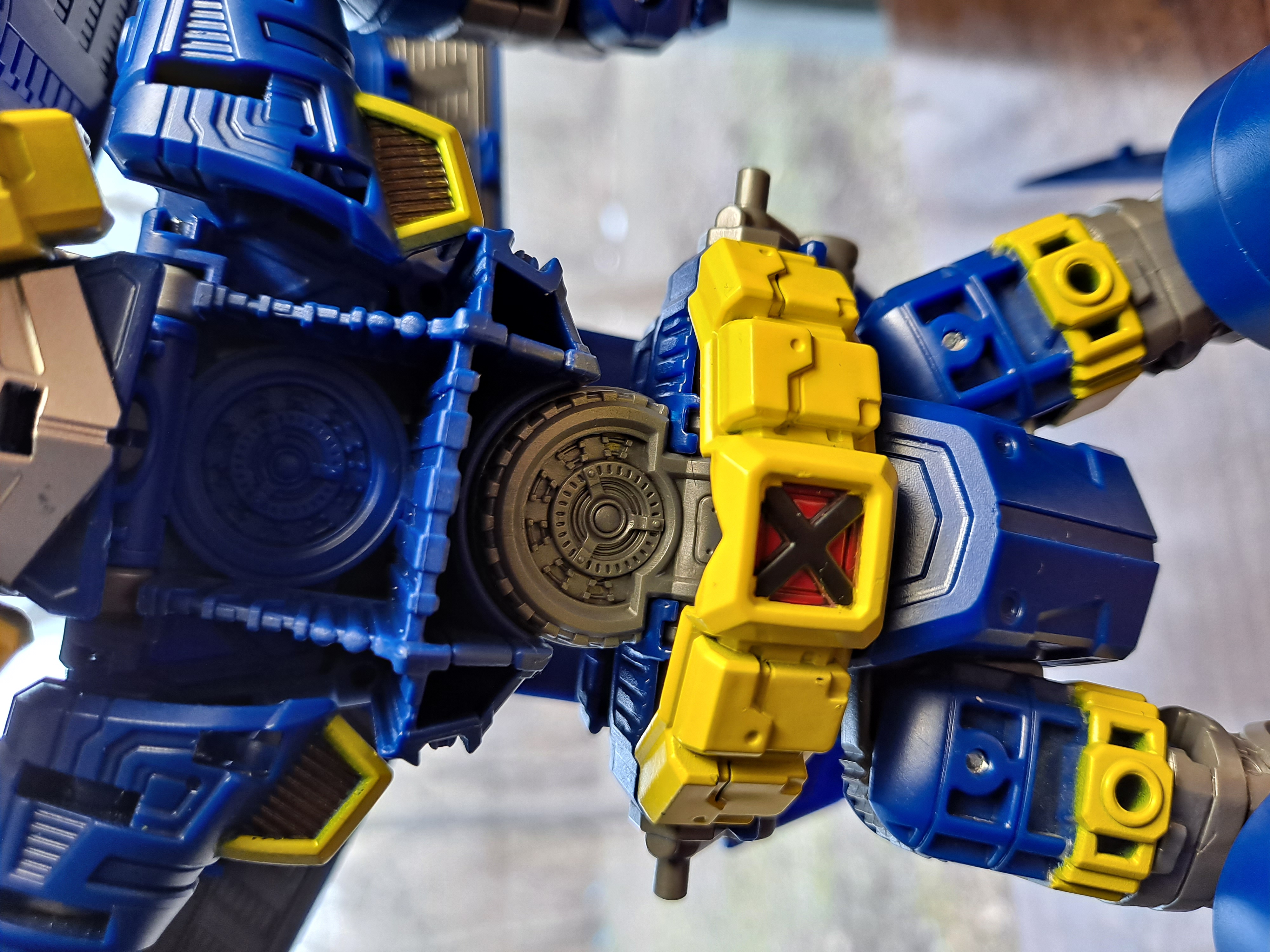 Most of the figure's transformation complexity is from the leg transformation, with a really clever double turnaround on the leg panels. However, the firmness with which they tab in can make it difficult to untab them to transform in either direction. You will also probably need to sacrifice a small child to get the various ratchets lined up perfectly to get things to play nice the first few times you transform it.