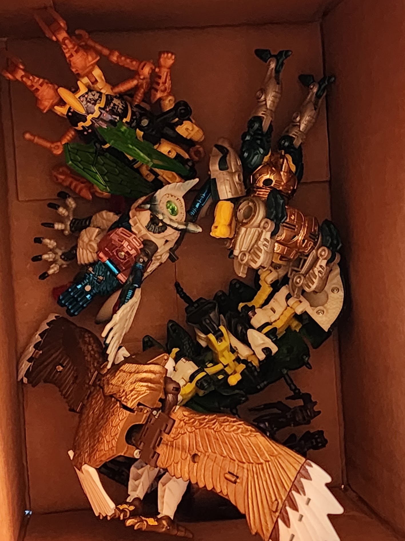 So I had a couple reasons to buy this. First off my Silverbolt crumbled around the bird neck so I've been hunting for a replacement for a while. This one doesn't have the eagle head or accessories, but I still have mine. As long as this one doesn't crumble I might have a Magnaboss again! Second reason I got this is I don't have Fox Kids Transmetals Waspinator (who I was going to use as Buzzsaw) and from the pictures I thought it was more complete than it was and the chrome was nicer than it was, but unfortunately the chrome is a little rough and he's missing one insect leg, both rear wings and his gun (which I knew going in and was fine with). The rest of figures are also incomplete, but I have all of them. Oddly, despite all missing parts they have very stiff joints, like the kid that had them idea of play was to lose parts and never touch them again.