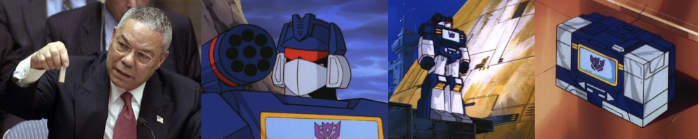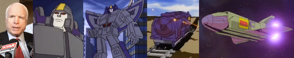 Obtain the author's permission before reproducing this article in large part or in full. All Transformers comparisons in this post refer to (and in turn parody!) the "Generation 1" cartoon and movie (1984-1987). Any crossover from that newfangled Michael Bay stuff is purely coincidental, I assure you. Imagery sourcing is fair use due to parody/commentary purpose, small size, and new composition.