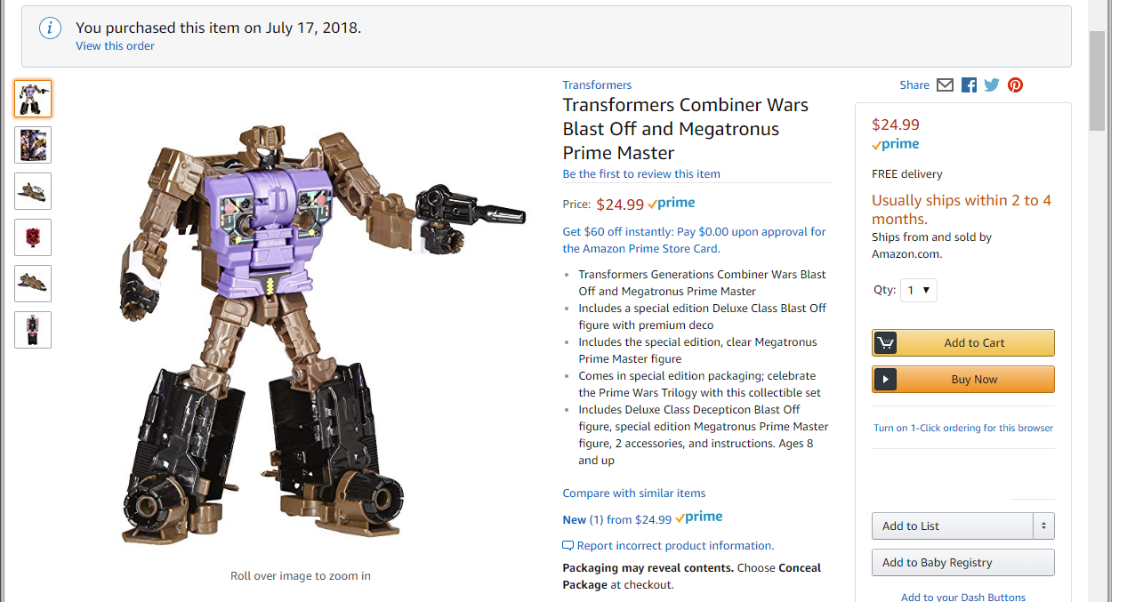DecepticonFinishline wrote:DecepticonFinishline wrote:Lore Keeper wrote:daoist wrote:Has anyone actually ordered Blast Off from Amazon?