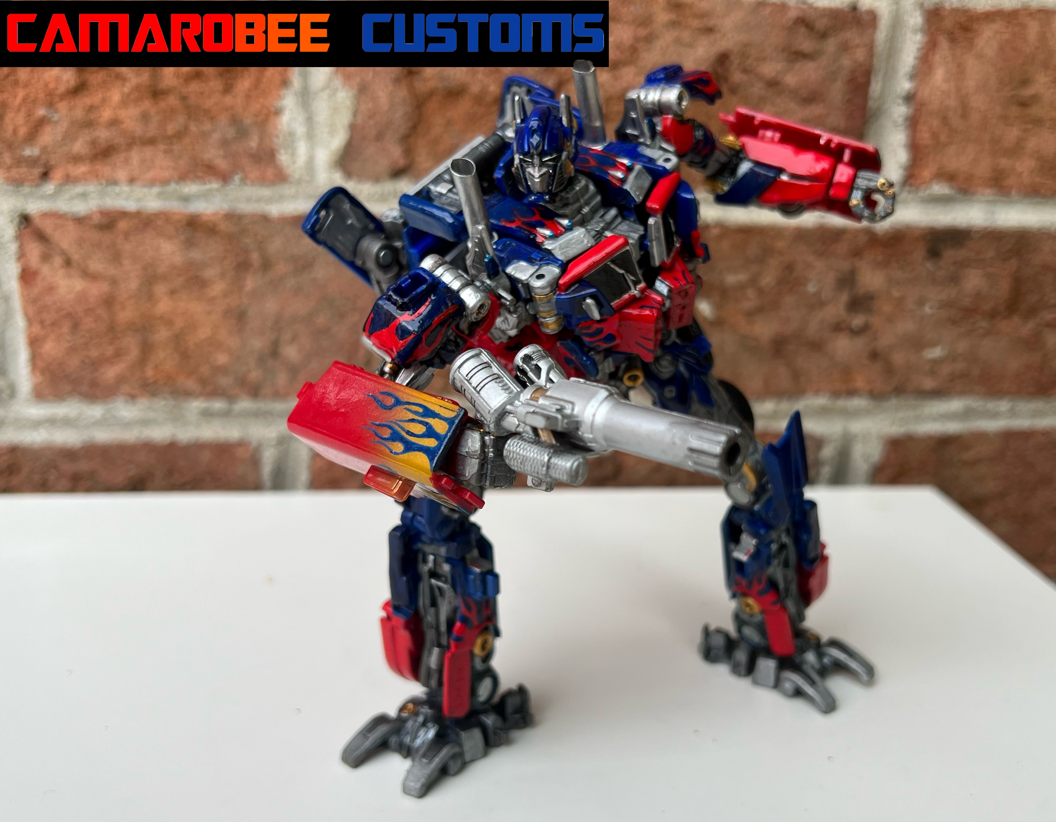 While I did publish an upload of this figure in the past, I wanted to be more ambitious with my paint work and make a truly definitive Optimus Prime. I've spent most of that time trying to perfect the flames, which were all hand painted (besides the ones the figure already had, which I traced over). I did make a stencil for the flames on the truck cab roof, but all the others were painted freehand.