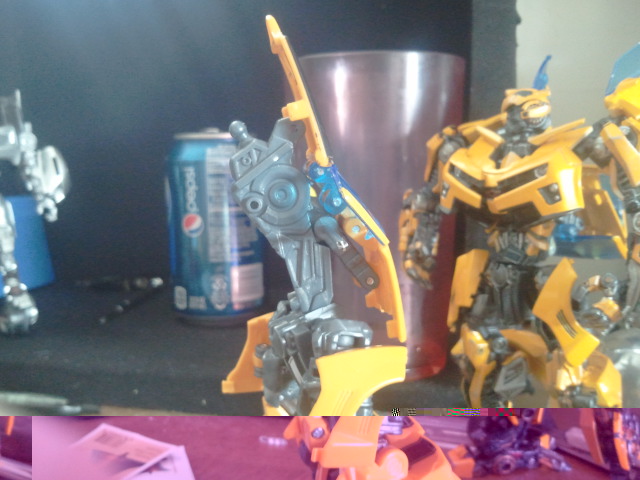 Hi there, This is the first time I've posted a custom here, but not the first custom I've done. Ussually I go with minor modifications, and repaints, but this time around, I've gone into slightly heavier modifications.I got myself an extra Hunt for the Decepticons Battle Blade Bumblebee so I could mod him all sorts of crazy. First what I did was removed the upper fenders from the hood and glued them onto the rest of the fenders. I wanted to just have them swing the doors into the middle of the figures back. Well, once I glued the fenders together, I realized that the back portions of the hood were in the way.. So, what I ended up having to do was cut the hood parts off, and glue those onto the central hood piece that is connected to the windshield. Once I did that, I already had it in my head that I wanted to cut the hinge pieces that the doors swung on off of the fenders and once I did that, I glued them into place in the doors. Now that they were free, I wasn't sure what to use to get the doors to be a part of the rest of the figure again.. What to do, what to do... Started looking at certain figures, and I realized that the arms from the RotF Legends Wheelie figure had exactly what I wanted, and through a LOT of trial and error (3 weeks worth). Finally, after going through 4 wheelies, the new swing arms are on, and allow the door wings to move in just about any direction that I want them to. Now, the mods STILL aren't done, and I am sending the base figure out to an acquaintance to help me out with some more mods. He will be adding a hinge and a ball joint to the windshield. The hinge will be at the seam of the hood, and the ball joint will be on the center of the central hood piece. This will hopefully, lol, allow the windshield to fold down into BB's back, and the hood piece to rotate around and sit flush against the torso's back. One other mod that he will be doing for me is going to be to make the rear hood become the smaller lower wings on BB's back. He has already done the mods to his own BB, and will be adding a ball joint to the hinge of the rear hood section so that it can spin around so that the lower wings will sit properly, and lastly, a fellow basher from TFW found a way to make the collar pieces for BB, and my acquaintance will also be adding them to my figure as well. While the figure is out, I will be doing some body work to the fenders and doors to make everything seamless with either bon-do, or maybe just some glazing putty. Until then here are some pictures of what I have done thus far!! Which is more or less finished other than the mods mentioned that will be sent off. When everything gets back to me, I have found the actual automotive paint that was used on the real Concept Camaros. Comments and constructive Criticism is welcome!! Thanks everyone!!