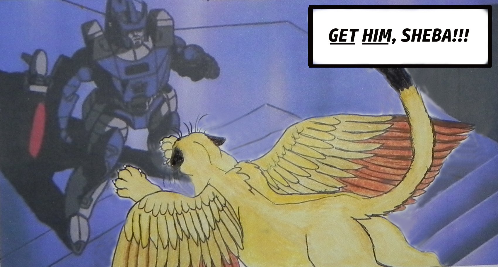 I printed out a screenshot of Galvatron in TFTM where I had taken a brush tool and whited out enough room so that after I printed it out, I added Sheba manually in the clear spot and then clone brushed the rest of the patches out. So this would basically be what happens if Sheba gets there before Galvatron can transform and Bad Comedy Starscream out of existence.
