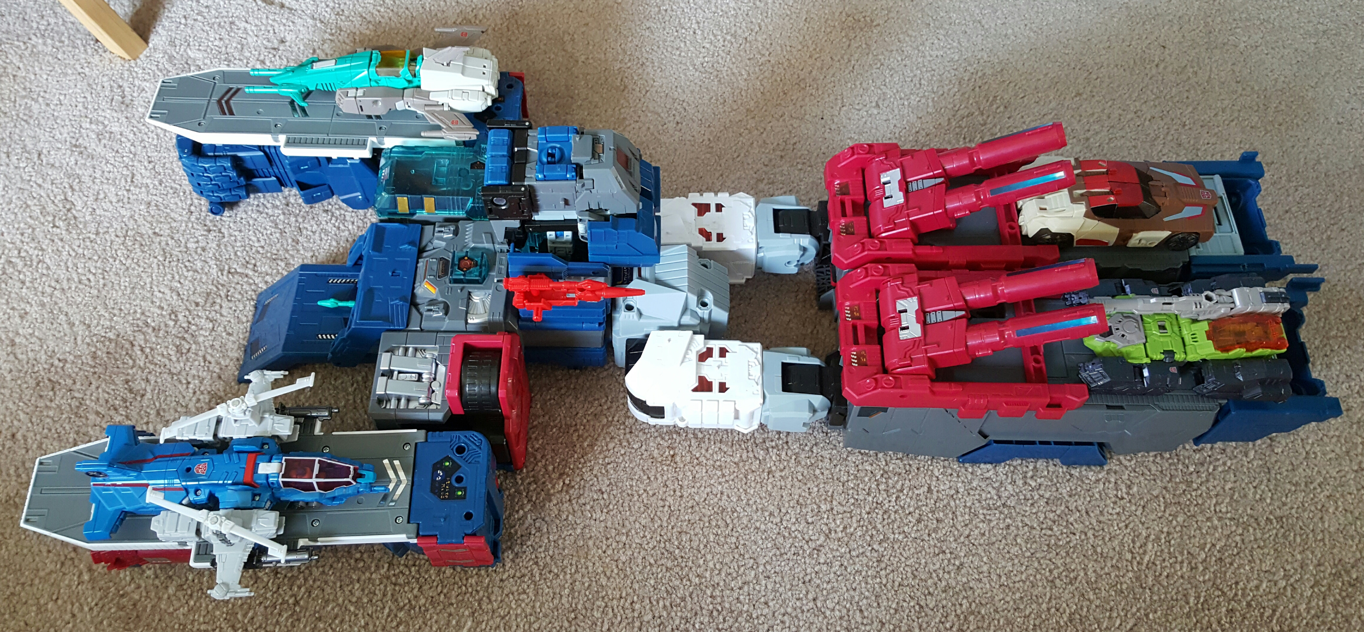 Now, next is his ship mode. It's my headcanon that Fort Max can mass shift to be large enough to contain the team (and more) inside, hence why you don't see them. But, I can't decide whether it should be like this, with the arms as rear thrusters: