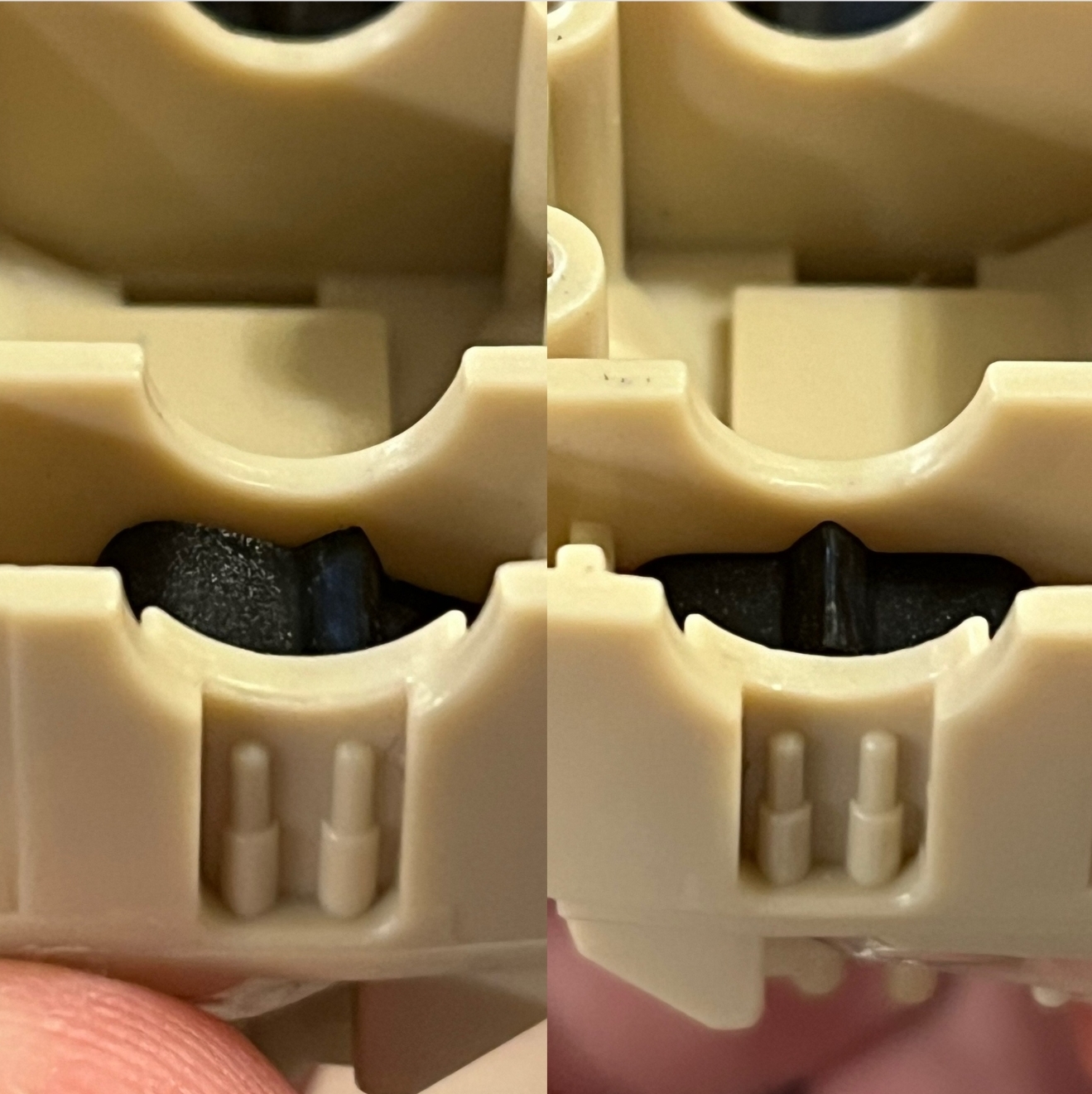 Unscrewing the four screws in the back of the crotch piece, a user was able to supply this picture, where the image on the left is the problem, and the picture on the right is the correct position.