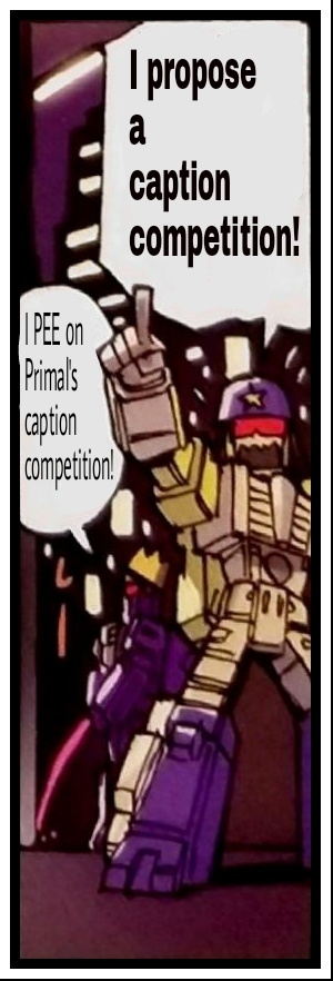 Sabrblade wrote:It's Astrotrain who does it, in the bottom-right corner of the first page.primalxconvoy wrote:Btw, even though I scanned the original comics used here, I can't for the life of me see Blitzwing (Blitzedwing?) having a wee outside in the street. Unfortunately, I HAVE seen my fair share of old Japanese men, at all times of the day, openly urinating in public. Is not masses of them, but fairly common, nonetheless.