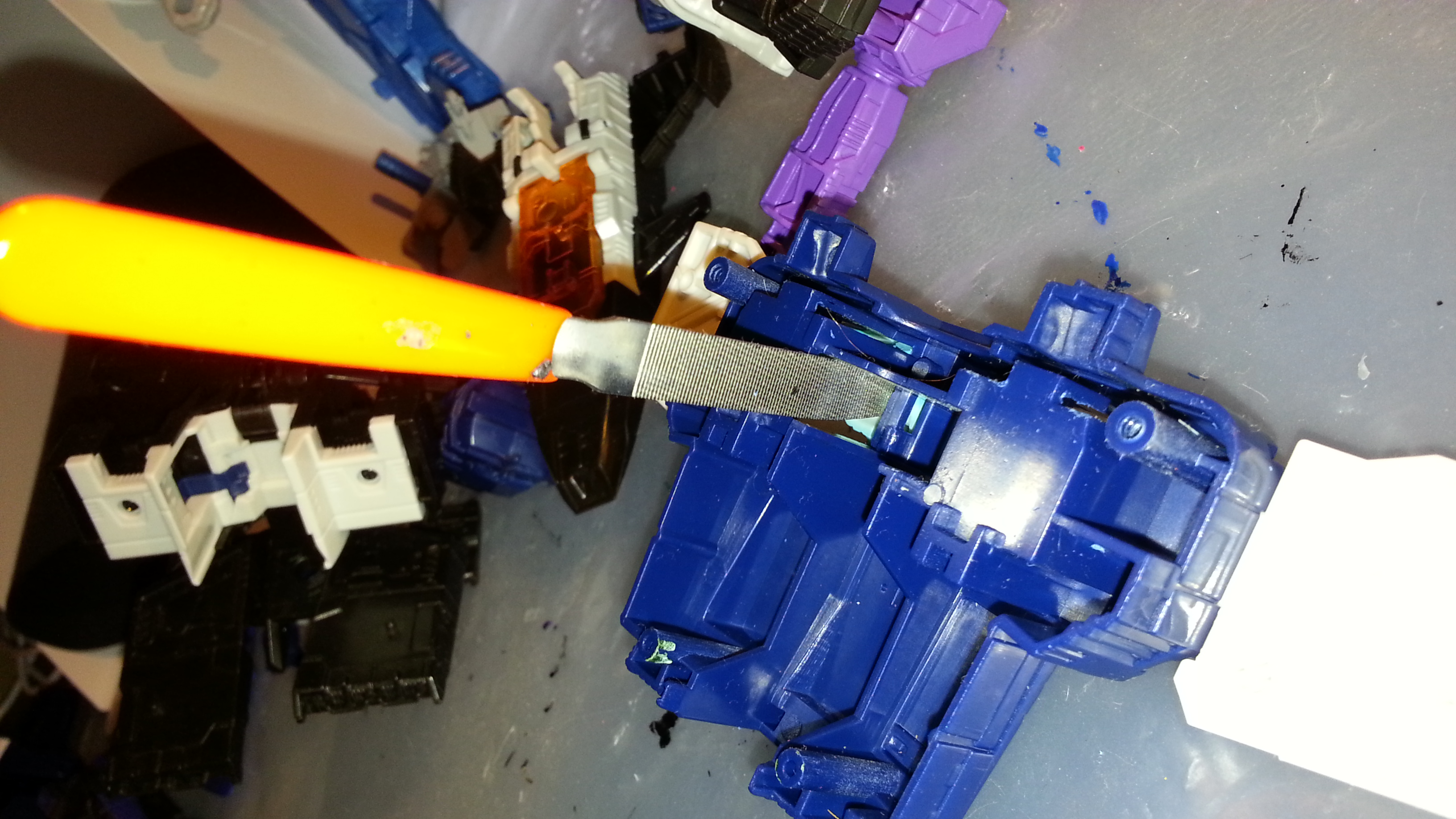 Currently, I'm in the process of modding my Legends Overlord... The engine block/sprues are rather soft, so it's easy to cut them with pliers and sand them down. I tried using some spare sprue parts and super glue to fill in the hollow parts at the back of the engine, but it didn't work. I suspect I REALLY need to use modelling clay/putty to put the attached screw into. Otherwise, the Titanmaster's own little head sits loose in the figure and the blue faux "head" on the engine overhangs the actual head, meaning it won't fit into the engine.