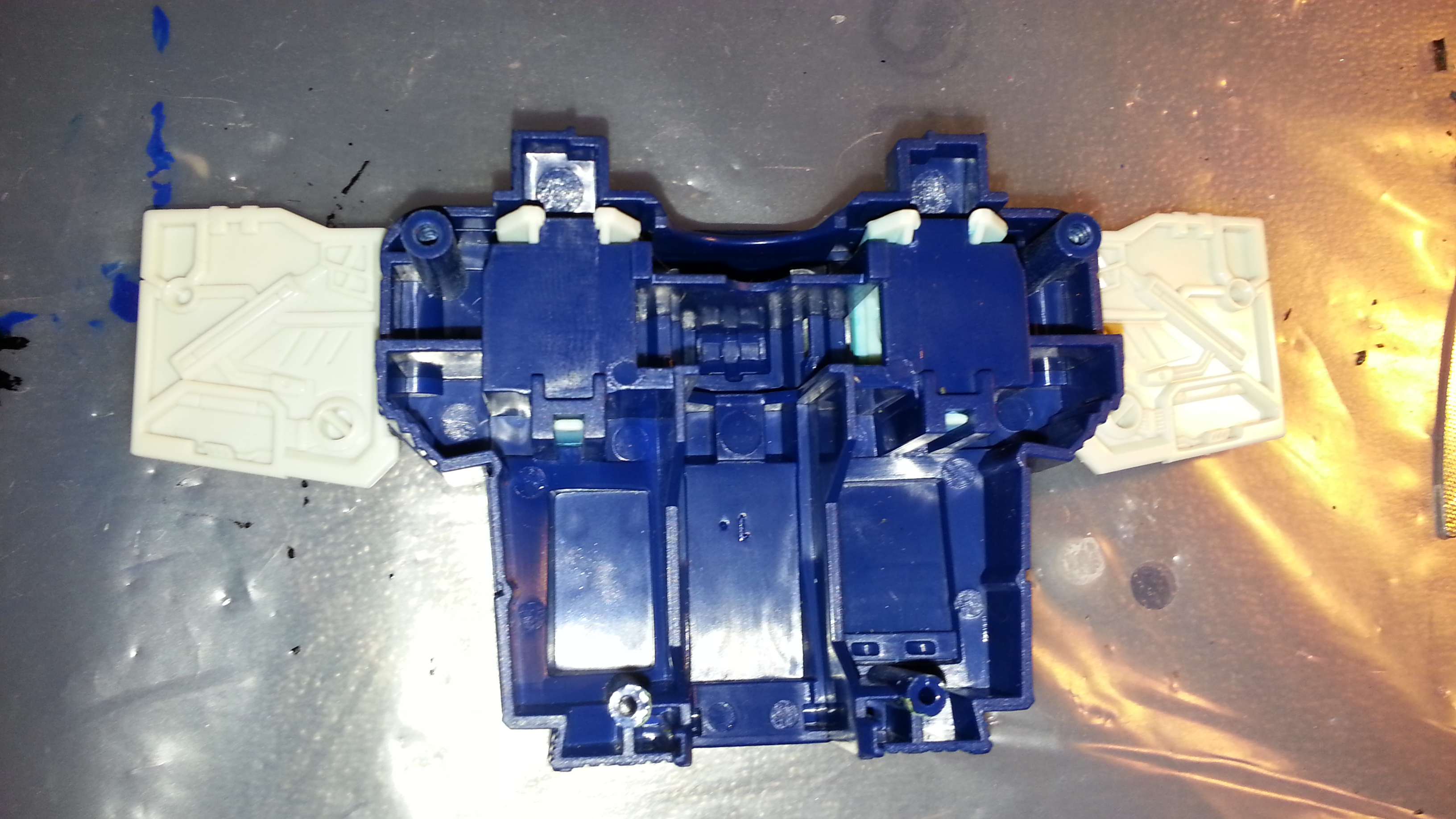 2/ Locate the teal "clips" that "hold" onto the back of the Titanmaster/POTP port (the cavity which holds the heads/engines).