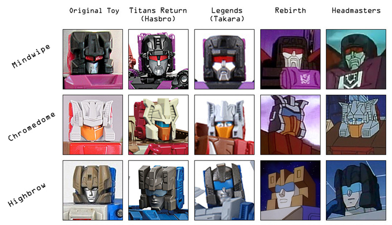 The comparisons do establish the trend of TakaraTomy retooling the faceplate of every main Headmaster, no exception. Makes making the complete list so much easier.