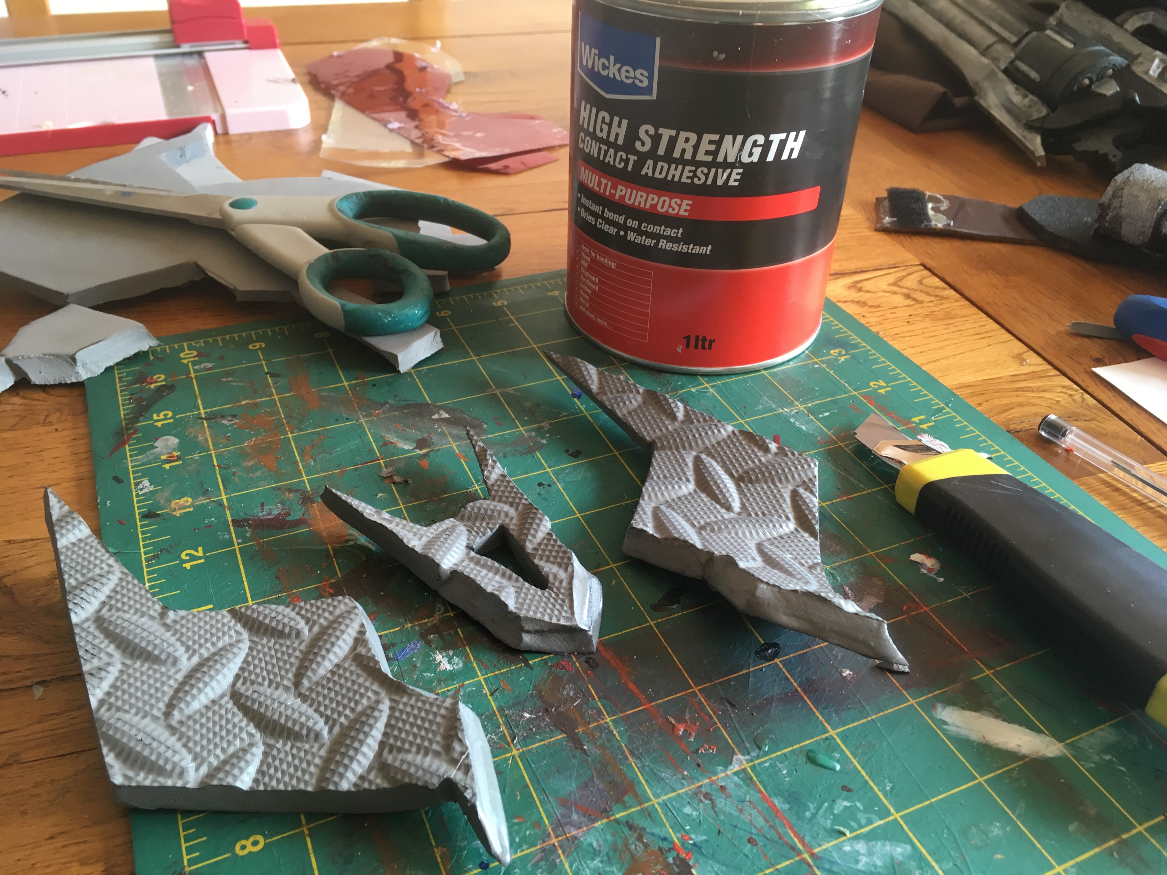 So with the template cut out, with each piece as shown, i drew around the template onto 8mm thick EVA foam using pins to hold the paper down