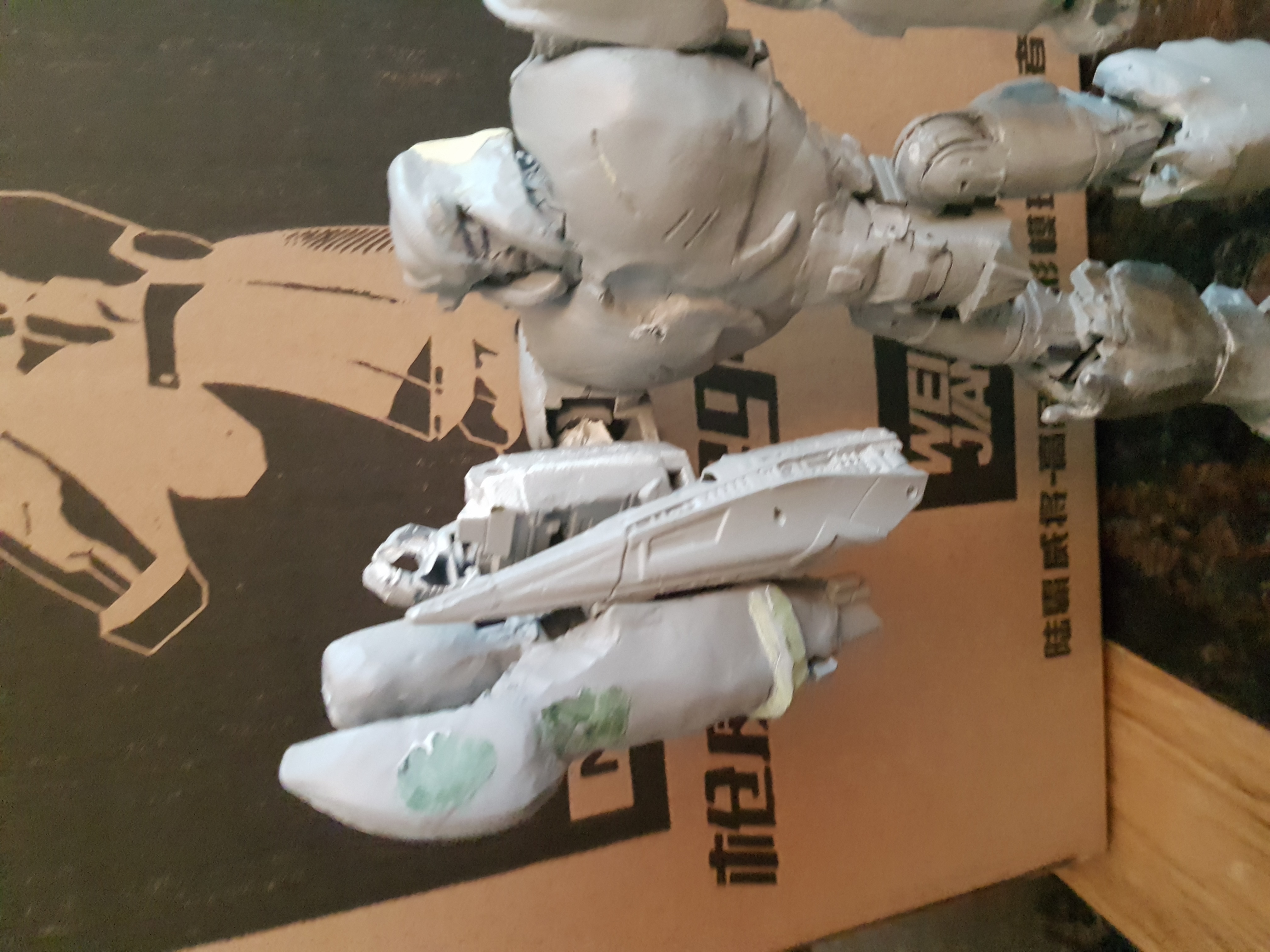 So, after a bit of a hiatus, I broke out the spray paint. Base coat and 1st coat done, the green showing through is just where I did a bit of remodelling on parts I was unhappy with. Another coat to do, then on to brushing with silver (as tested on the left lower leg) the detailing.