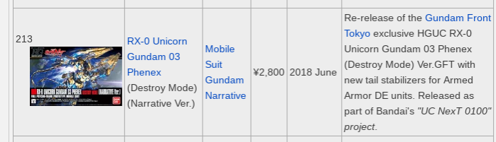 Probably because of the gold plating, but still a bummer...I wonder if they'll do an RG Phenex now that Narrative is out, though that'll be pricey too. Hoping for a plain RG Banshee as well so I could give the OVA weapons to the Norn and keep the other as the Ver Ka. I don't remember the HGs being P-Bandai...?