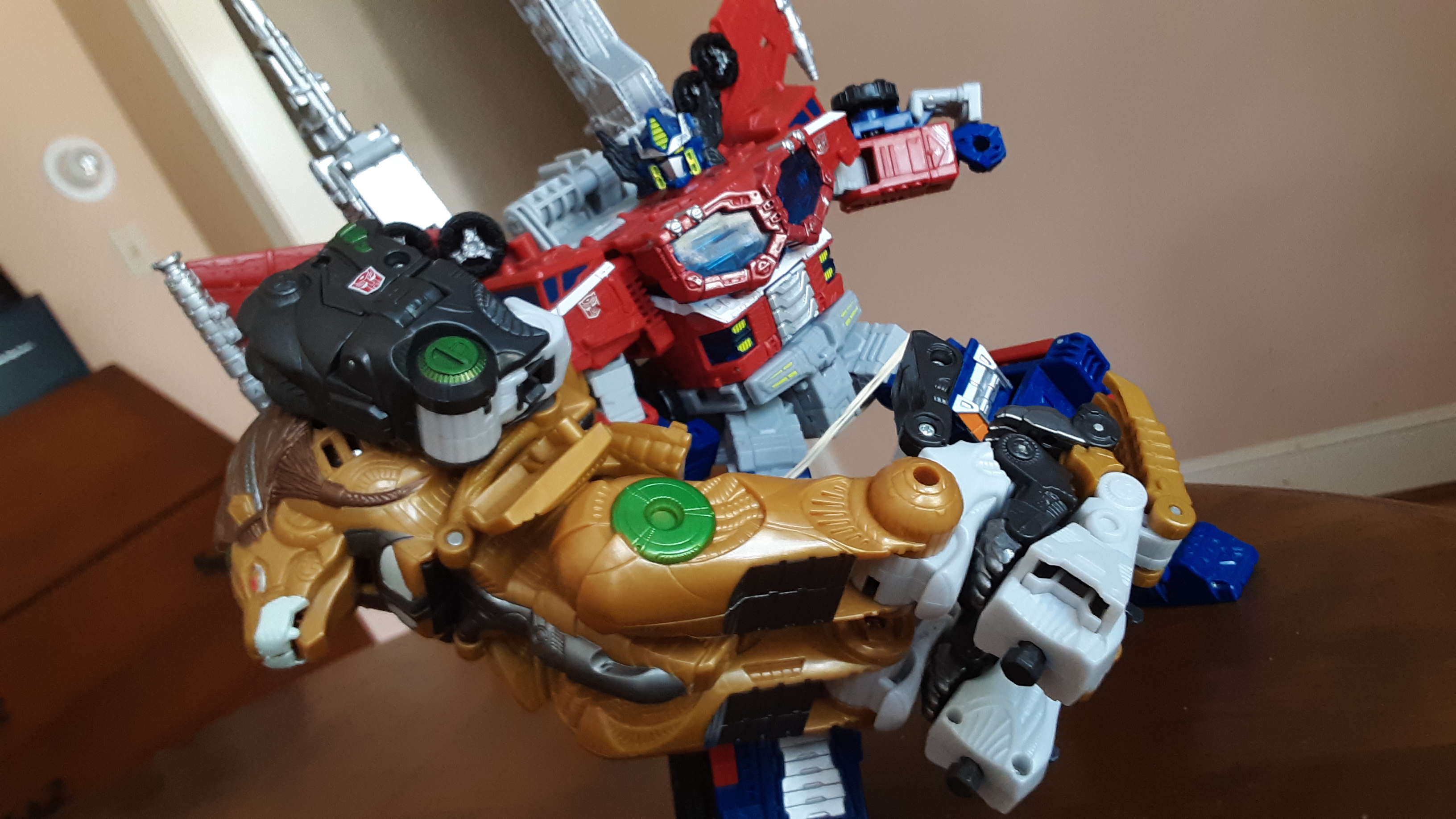 Too bad I can't do Savage Claw Mo- Oh wait a minute, I can! The shoulder piece of Siege Galaxy Prime is able to fit Leobreaker's joint. He's way too heavy for Prime, but I was still able to have some fun recreating this pairing.