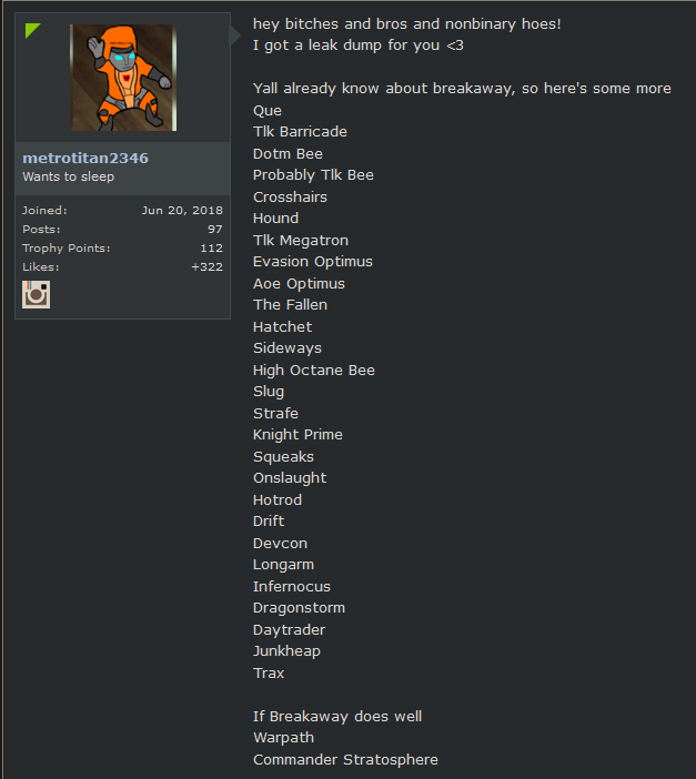 Autobot N wrote:This is probably a good time to mention that TFW’s main leaker retired from leaking a few days ago, so expect leaks to drop off drastically from now on
