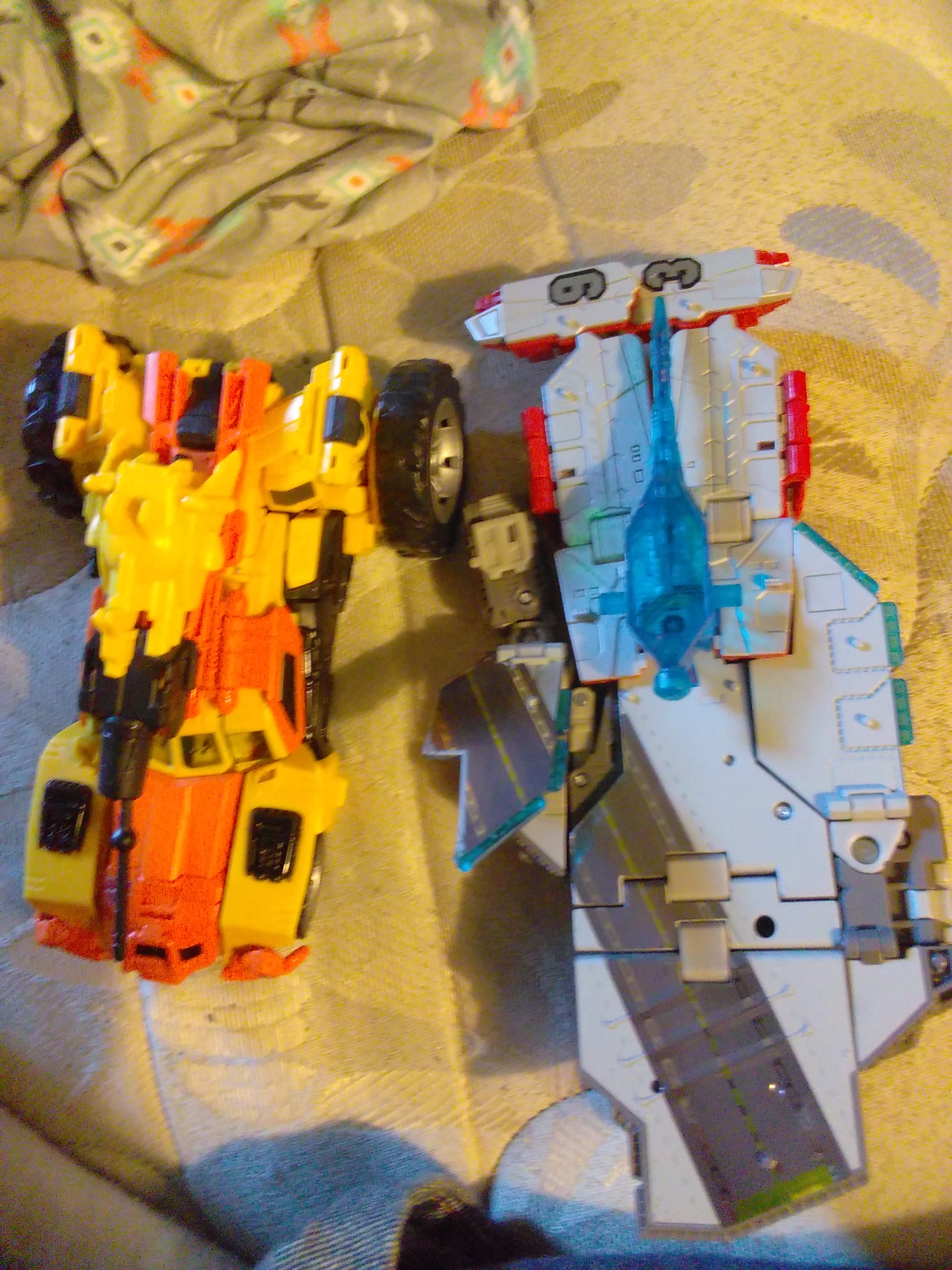 Here are the triple changers I got in the mail from an online person who's not obsessed with getting PayPal payments. As you can see, I'm able to get one of the sides of Broadside reattached; but I can't figure out how to get it aligned properly. If it was a G1 Broadside, which I'm not a big enough fan to shell out tons of cash for, I could figure out how to transform him in my sleep because that's how easy he was when he first came out. All I had to do was look at the package, and I could figure it out because it covered everything except pulling out the arms. I'd like to see a picture of Sandstorm in air vehicle mode so I can figure out which one he is exactly. Of the three of these Transformers, that's the one I'm fascinated with the most.