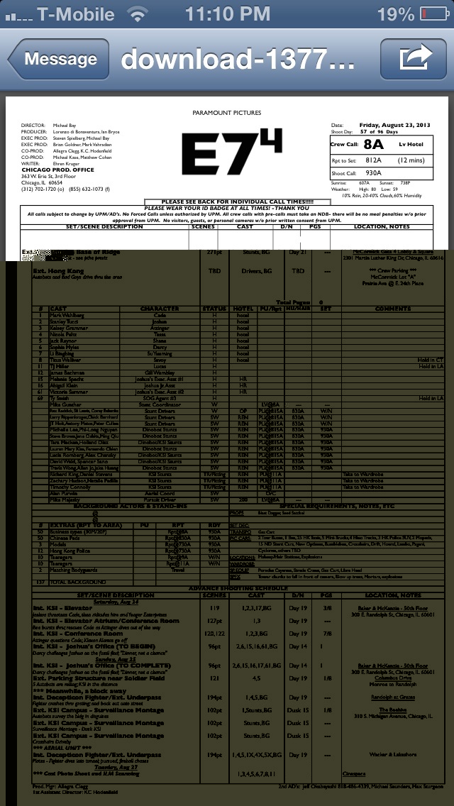 But wait there more! The sheet also mentions "1st Dinobot Attack" and goes on to list multiple actors assigned to Dinobot Stunts! That's right, it appears all the rumors were true, and despite director Michael Bay previously stating he did not like the idea of Dinobots, they are in the film.