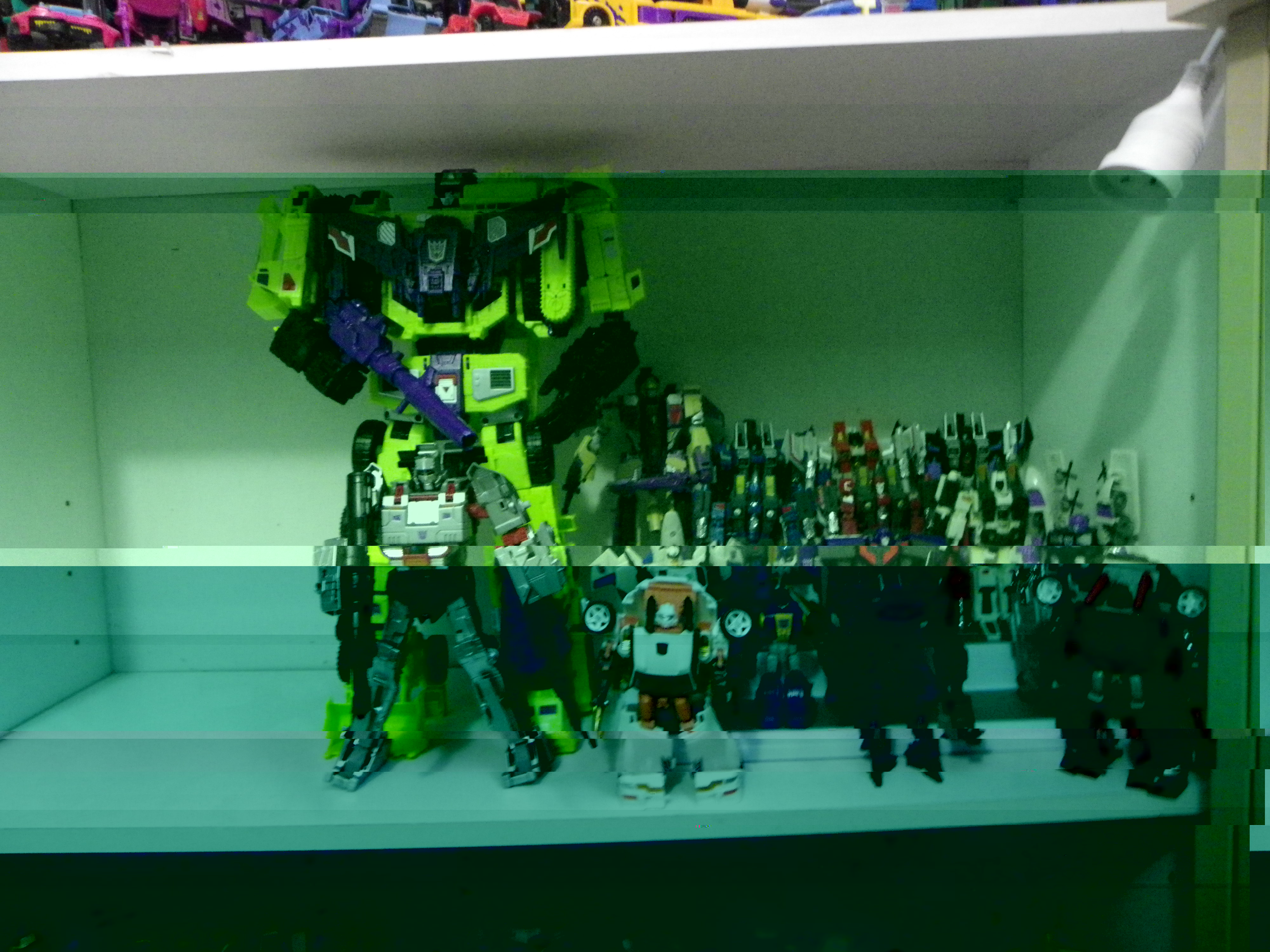 Then I realised that said free shelf is adjustable. Was able to drop it down a little (not much room now between he shelf and the top of Animated Megatrons head!) to squeeze Devastator in. The annoying part is Hooks boom which hangs out behind, quite a considerable distance which leaves a bit of wasted space behind him. I know it's never been done in any of the fiction, but geez it would be nice of that boom could fold down.