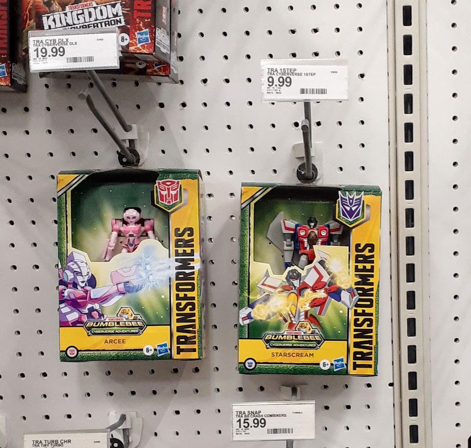 Hasbro has quietly rereleased Transformers Cyberverse Deluxe Arcee, Bumblebee and Starscream in the current Dinobots Unite packaging. Like the previous wave these will likely not include the parts to build Maccadam despite what the stock photos show but you'll still get the other weapons and effect parts, just be sure to inspect those open air boxes to make sure the parts didn't slip out! And hey, you can go to Target right now and buy these if you're lucky to have a local store that's reasonably well stocked (or even not well stocked as you can see from my photo below). Or you can go over to Target.com where they're currently in stock, click on the photos to be taken to the figure.