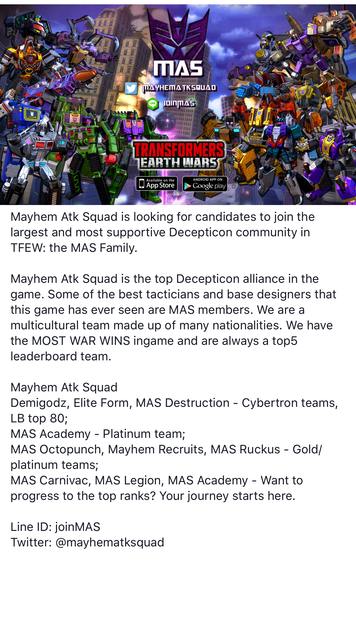 Contact us, no matter what you HQ level, we many alliances MAS family for many different levels.