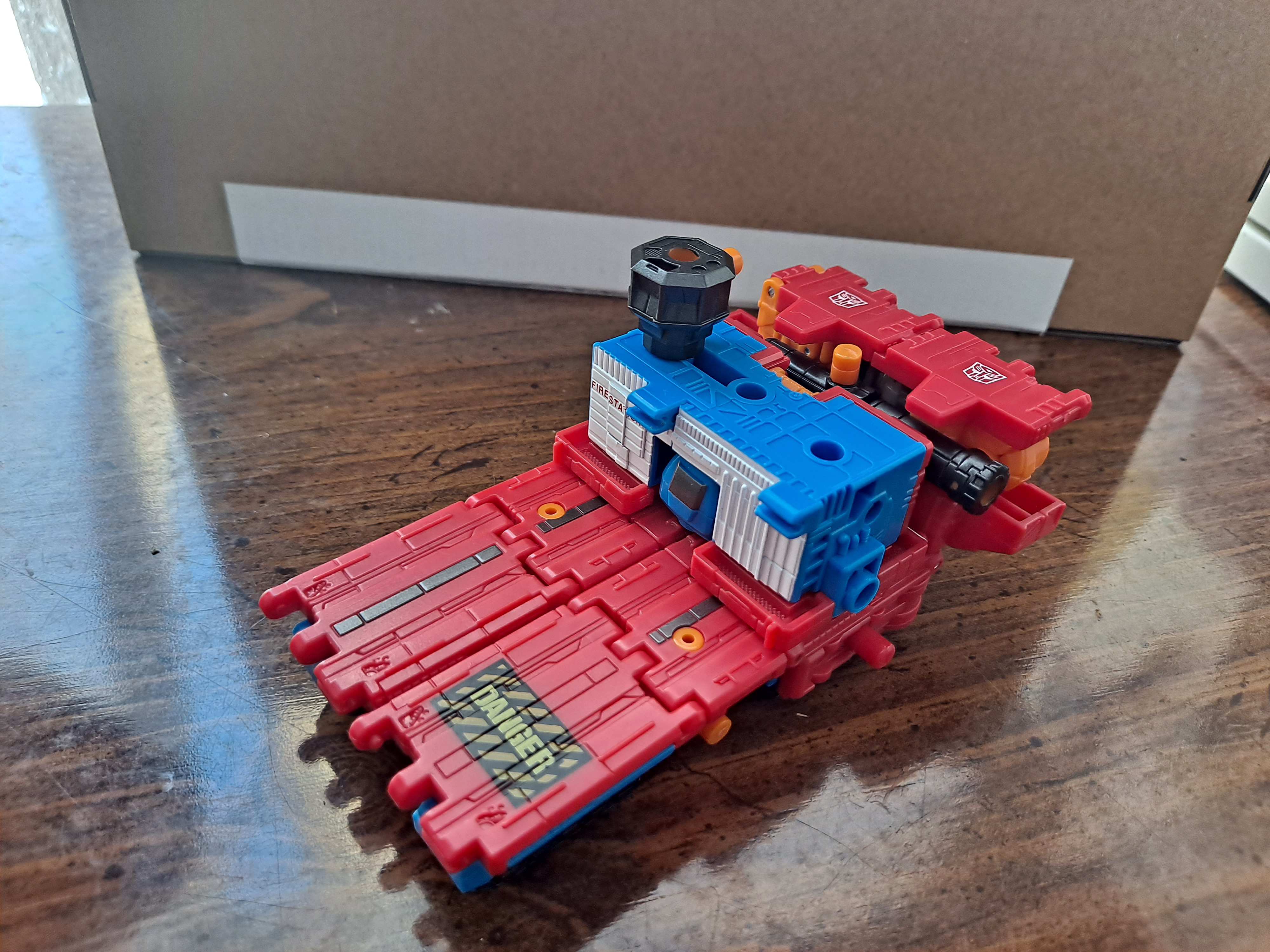 The lack of parking lot doesn't look as bad when closely connected to another modulator. The tank actually came out pretty well, although it does suffer from megatron tankfeet syndrome. You need to make sure the knee pegs are tucked in at an angle for clearance, shown in the side shot. The turret is also able to rotate and elevate.