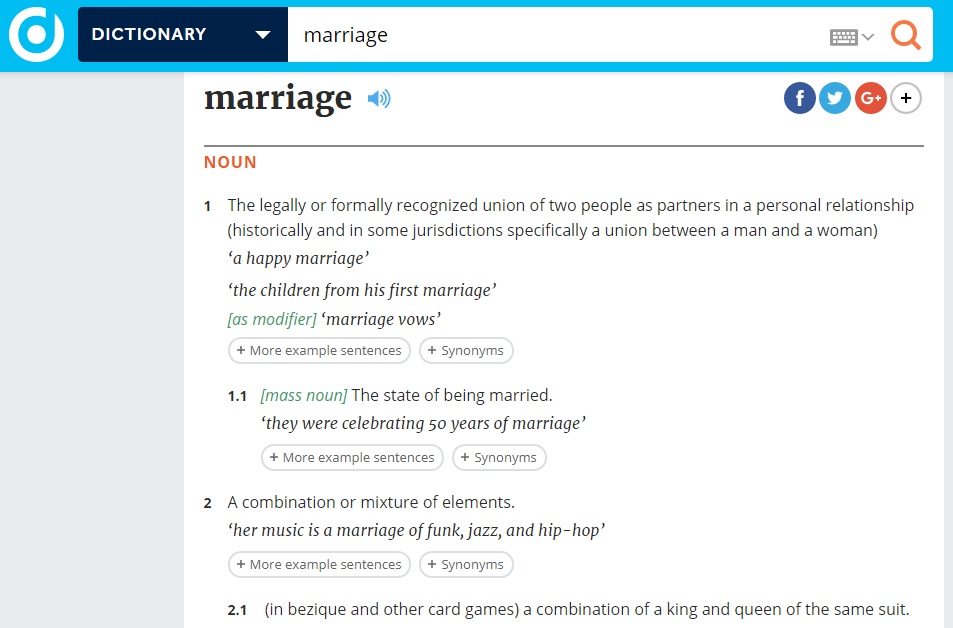 But as it is now, the only definition of 'marriage,' right or wrong, is "the union between a man and a woman," and therefore doesn't apply to same-sex couples. Unfortunate fact of life.