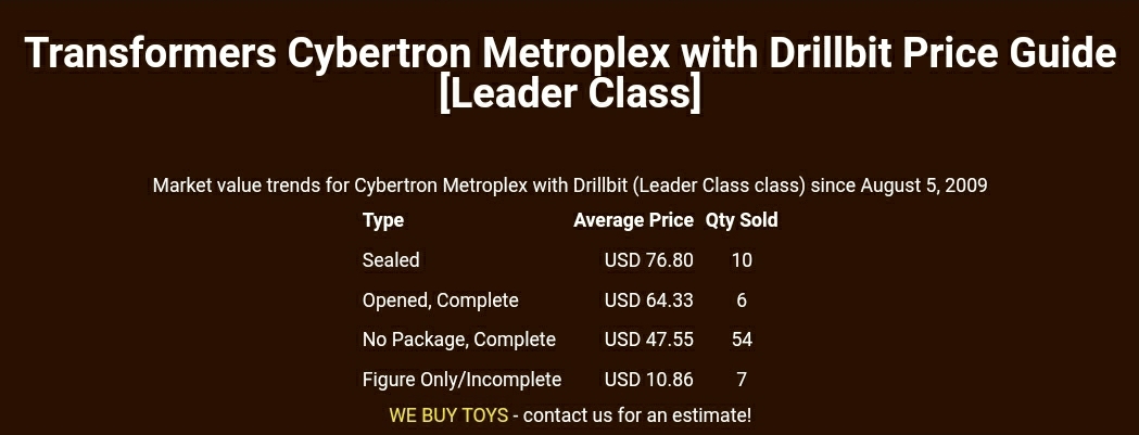 I disagree. However, as a disclaimer, I'll acknowledge that I'm going on observations from around a year or two ago. That said, I saw Galaxy Force Metroplex going for around 10,000 yen or less at Madarake and other similar shops in Akihabara, and I've seen the odd one in Book Off (or equiv) for a bit less. I've seen two-packs for Big Convoy and Magmatron, Galaxy Force Optimus Prime, Korean Beast Wars 2 figures, etc also keep fairly stable prices (just above retail or staying around 10,000 yen).