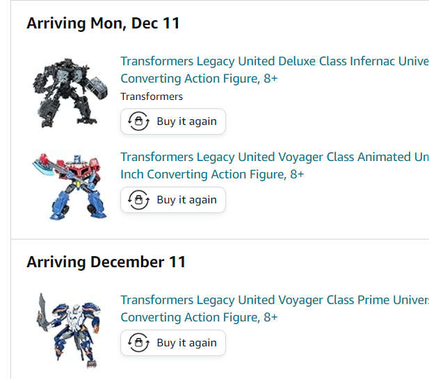 o.supreme wrote:Yeah, good thing Magneus was the only universe wave 1 thing I pre-ordered (especially now at almost $27 for a deluxe after tax yeesh...), wasn't expecting it so soon. Also laughable, we are already getting 2024 line stuff from Amazon, but no Target or Walmart near me has anything from the last 2 waves of Evolution, and many Walmarts still have 2022 product on the shelves... Hasbro had a good idea when they started with PotP, and carrying through WFC; changing the UPC code each year. I wonder why they dropped it for Legacy?