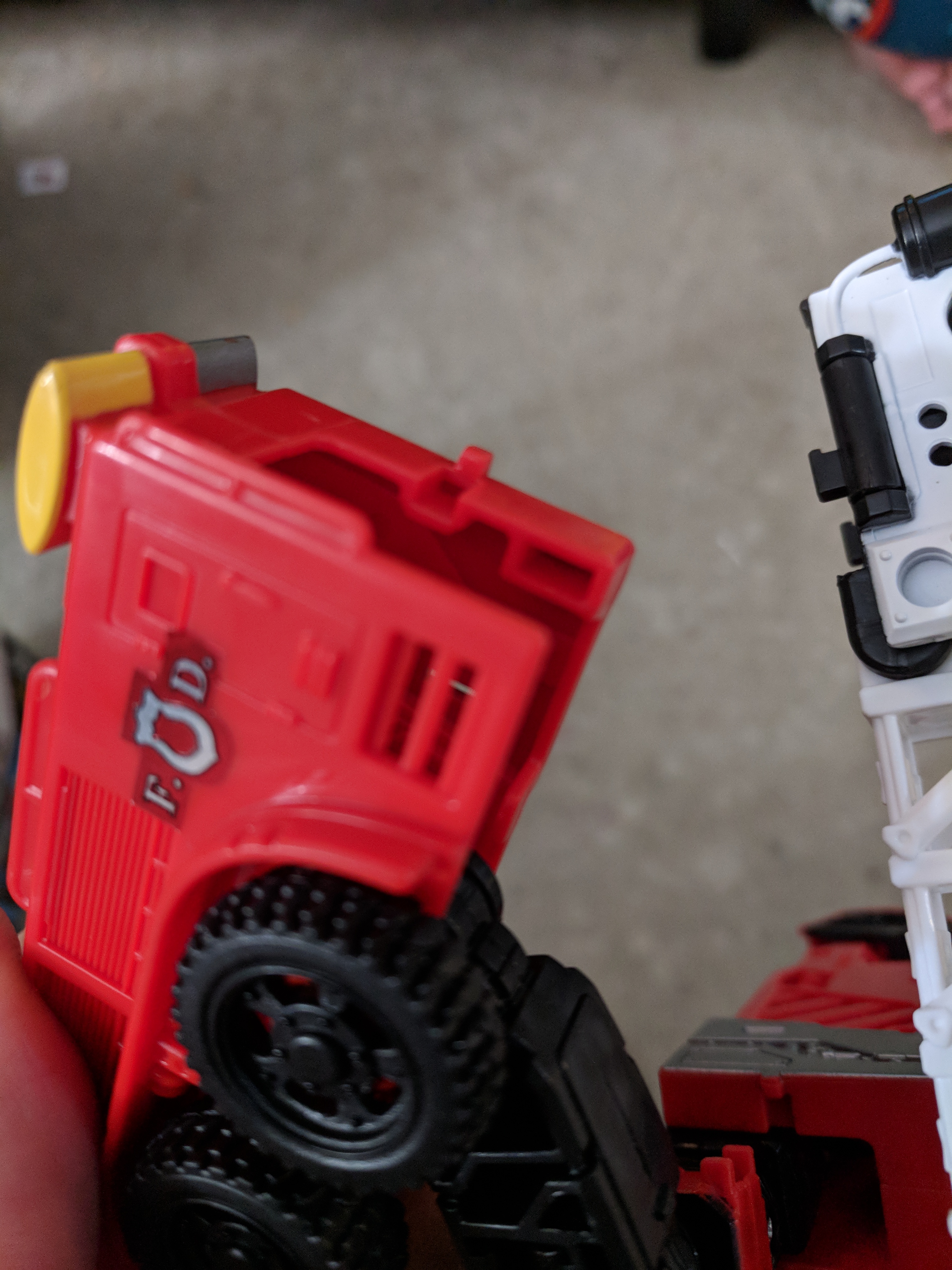 Plastic quality is standard and the clear parts aren't structural so he's pretty solid. Plus he doesn't have massive open gaps in his arms and legs. He also has a pretty fun transformation. Plus, to Hasbro's credit, Grapple has a bunch of new molded parts in his arms, hands, feet, various panels, the crane, and of course the head. Sure, a ladder on Inferno would have looked better in truck mode, but it's obvious in bot mode why they couldn't.