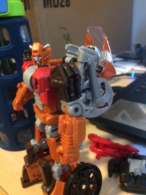 the stock photography claims that the elbow on his right arm is correct, while the other uses of the mold and his box claim that the elbow attached to his left arm is correct. So I'm confused and annoyed, but I can't really fix it without additional arm parts, he can still transform to bike mode regardless, and I guess it adds to the Junkion asymmetry, so that's not that much of an issue.