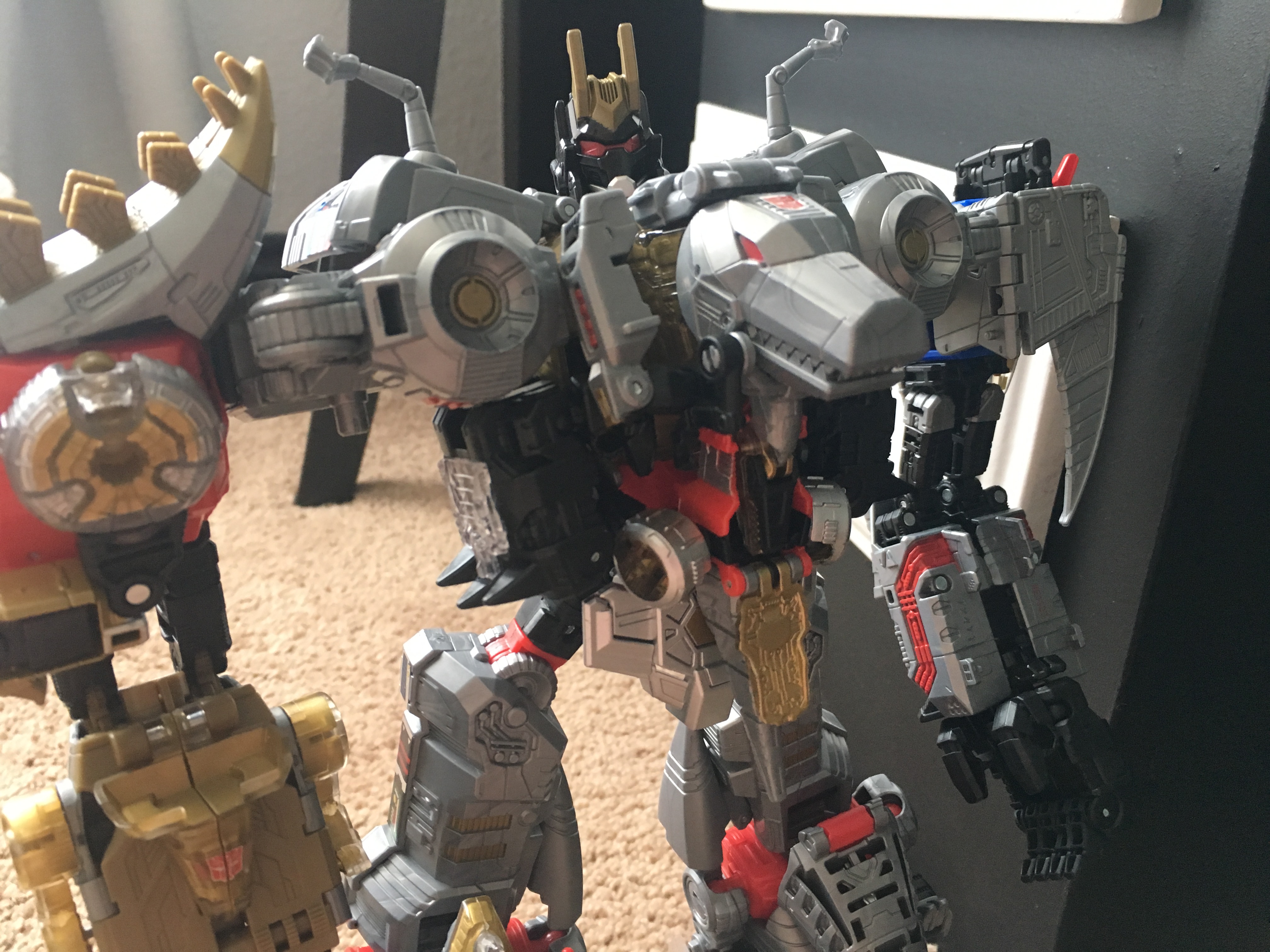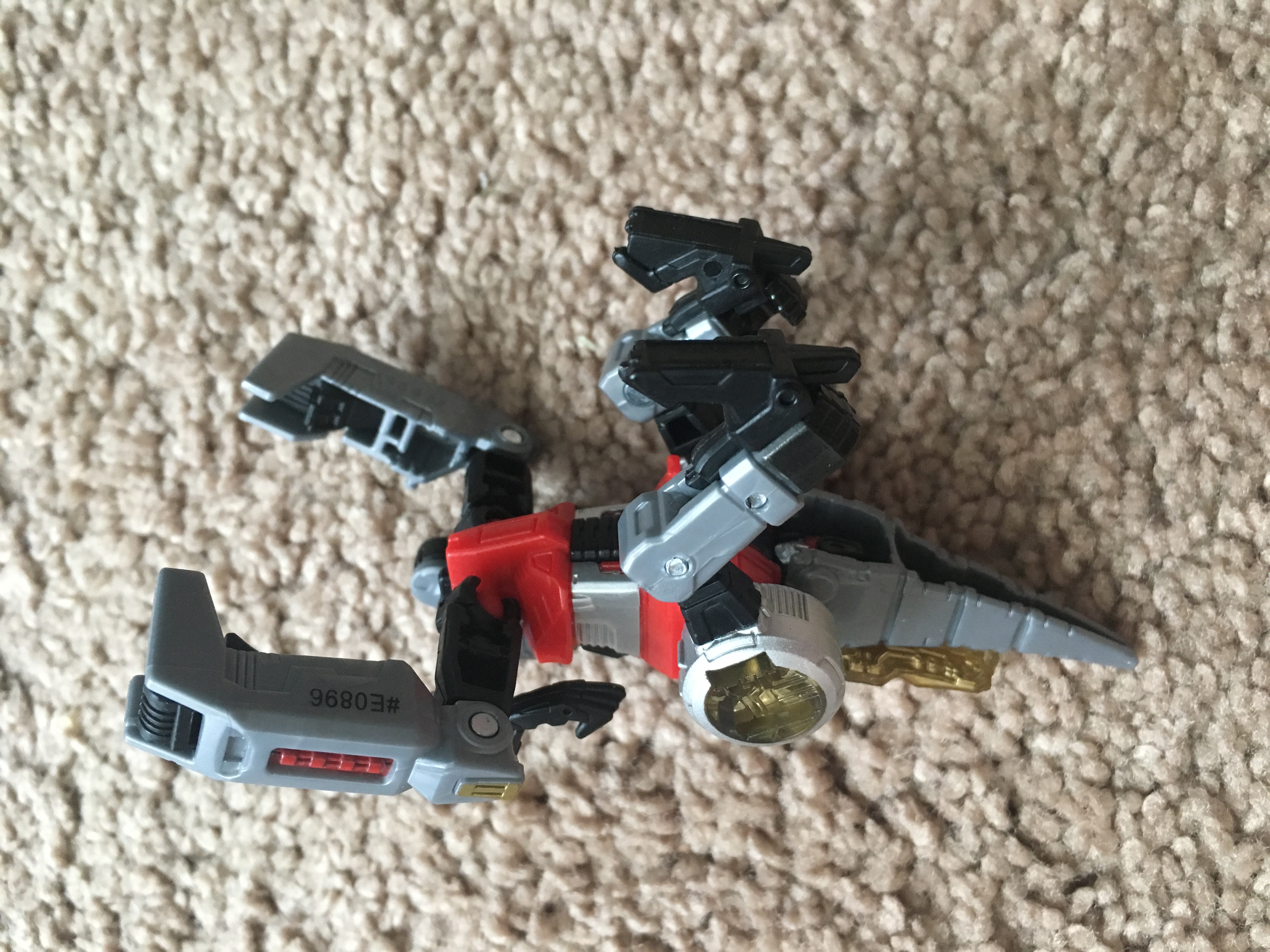 This is what I did. The frame that the dinosaur hands are attached to cradles Grimlock’s t-rex chin nicely. Slash’s dinosaur legs insert between the combiner torso and the extra hands/prime armors very securely, while her legs frame the sides of the t-red head. I think it adds some nice bulk and fills some of the weirder gaps.