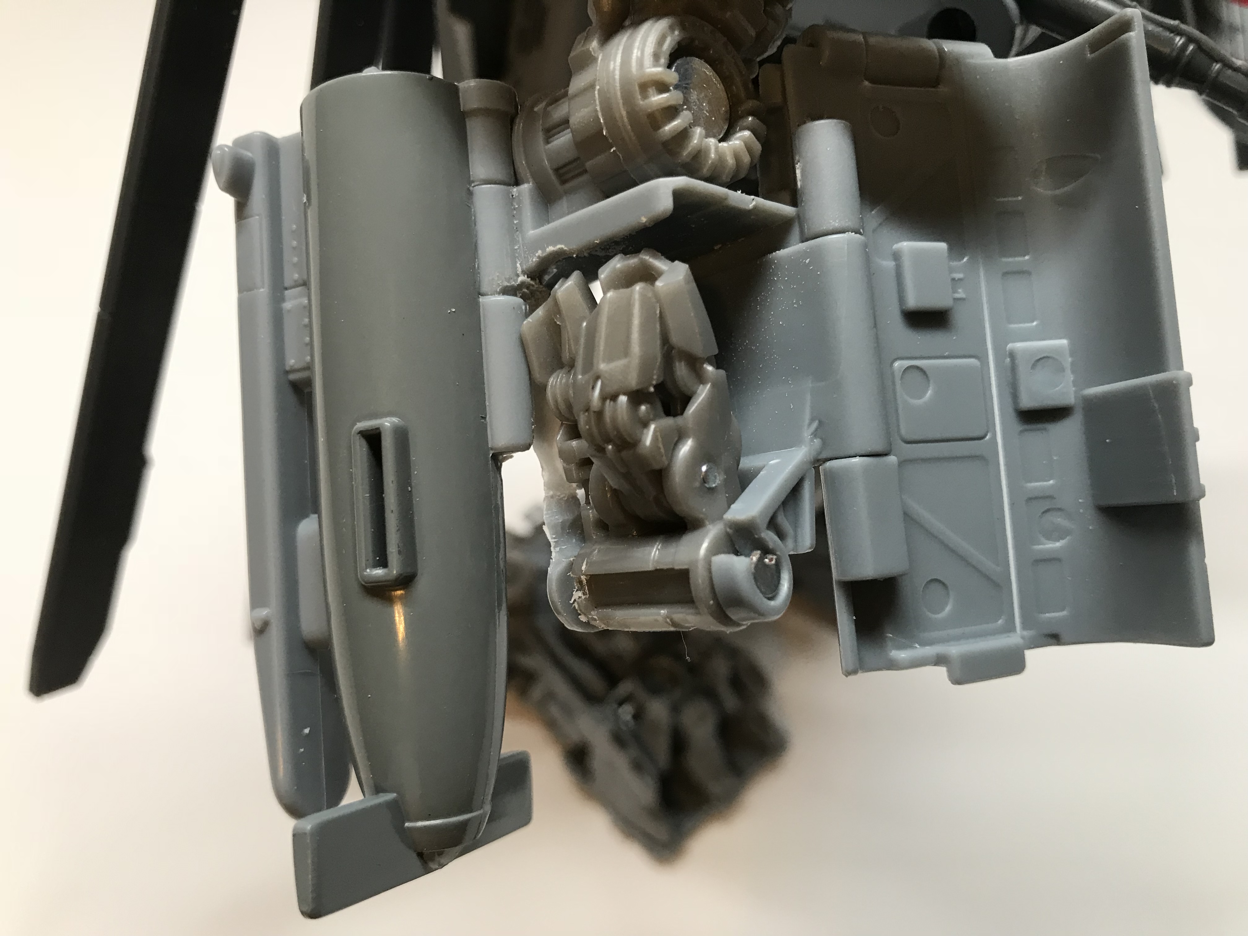 wheelhousean wrote:For my Blackout figure, I chose to keep them horizontal, but swapped the right and left sides and rotated them 180 (those pins were no joke!). I then dremeled inside the arms to allow the hands to fold back up without showing in alt mode.