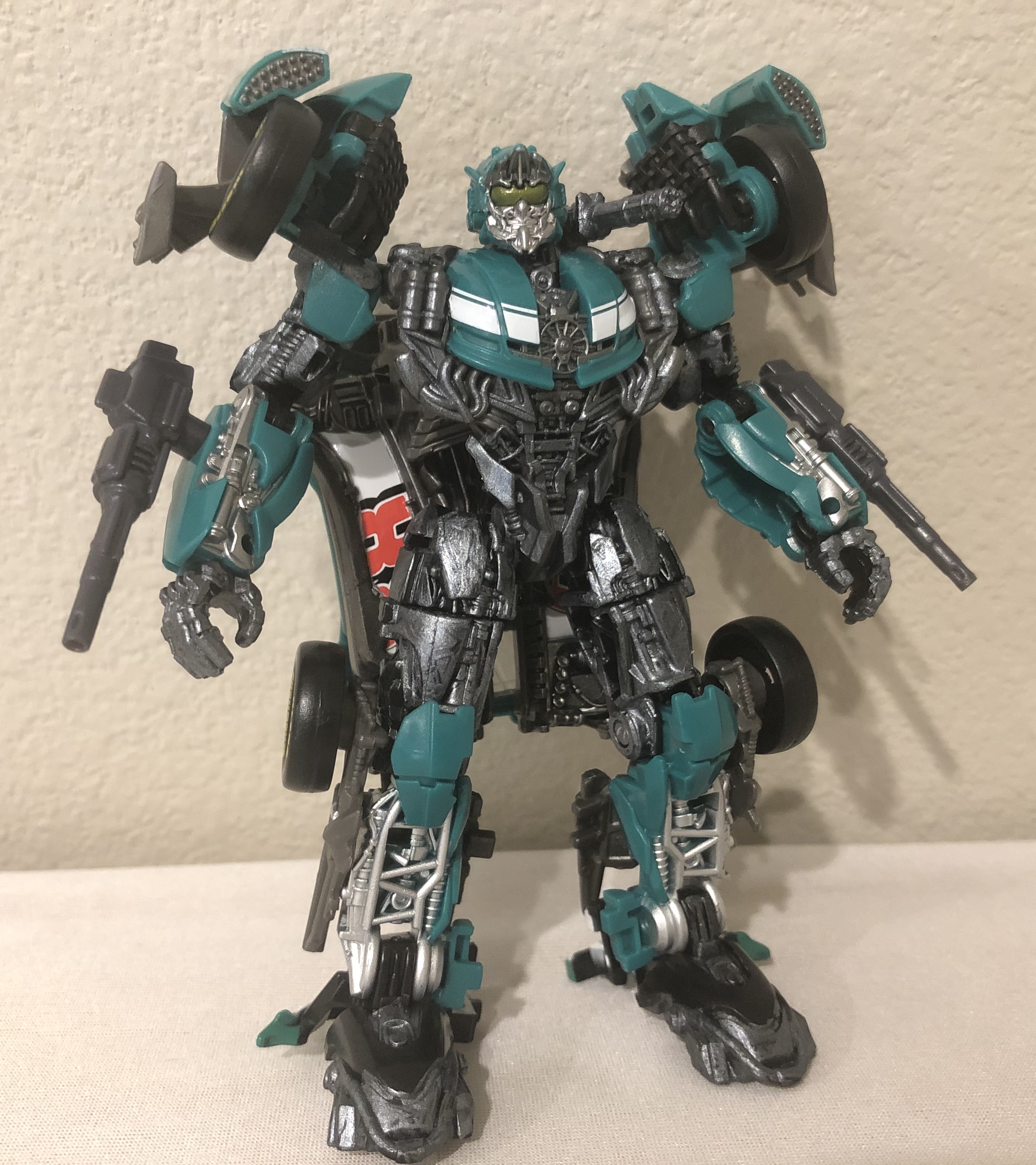 I won’t be able to fully paint him for a while since I don’t have green paint and I’m busy working on Sentinel, but I did go over a lot of the parts with gunmetal real quick earlier. I also borrowed some guns from DOTM Topspin to help arm him up!