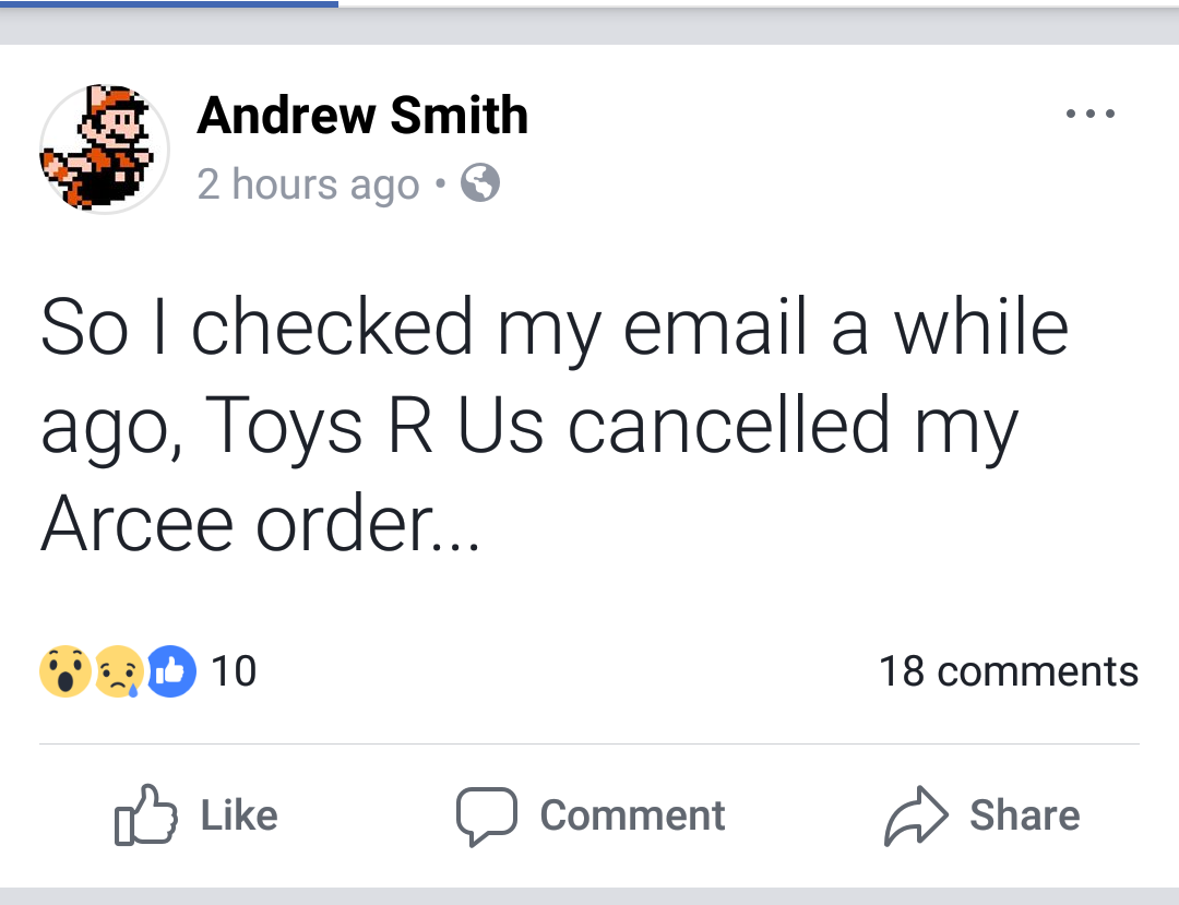 Similar thing happened to me last year with some neca figures on 2 separate occasions, TRU either needs to fix there preorder thing or just stop doing it.
