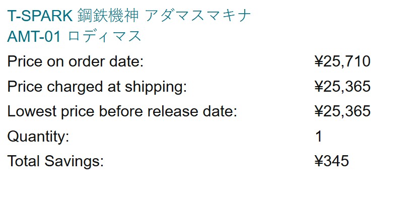 Did you order anything else with it that would have split the shipping or something? Here's my receipt, it comes to just over $191 and I ordered back in July. Apparently the pre-order guarantee only saved 345yen or $2.34, the figure alone would be $165.