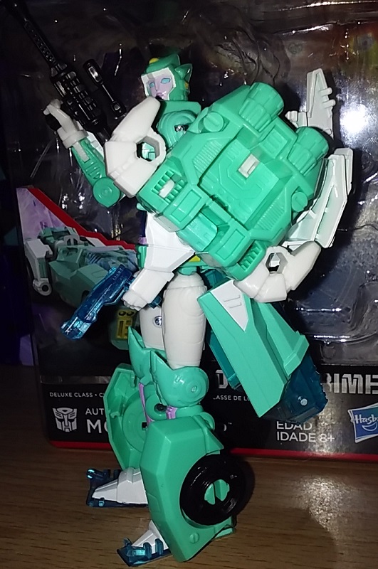 I don’t mind Moonracer’s backpack really. I don’t find her to be terribly unbalanced, despite its size. Her double jointed knees are nice, and I’m digging her pastel color. Looks great with TR Arcee, Windblade, and generations Chromia.