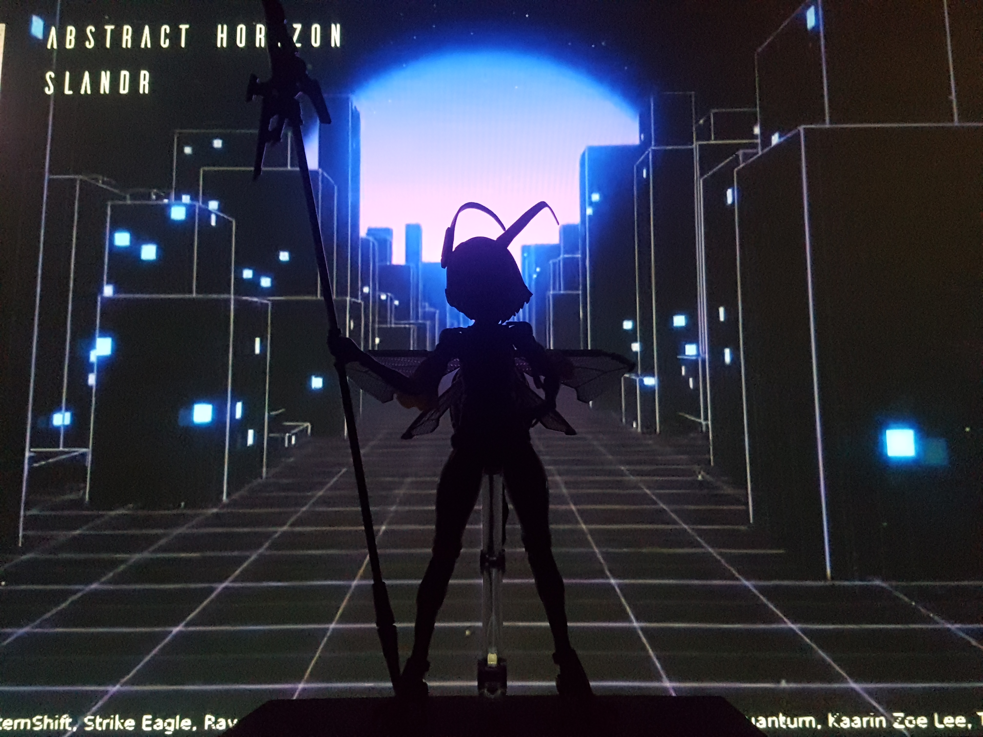 One pose in front of the visualizations from this live synthwave youtube channel. I don't know I get a synthwave vibe from her, it just seems to fit to me.