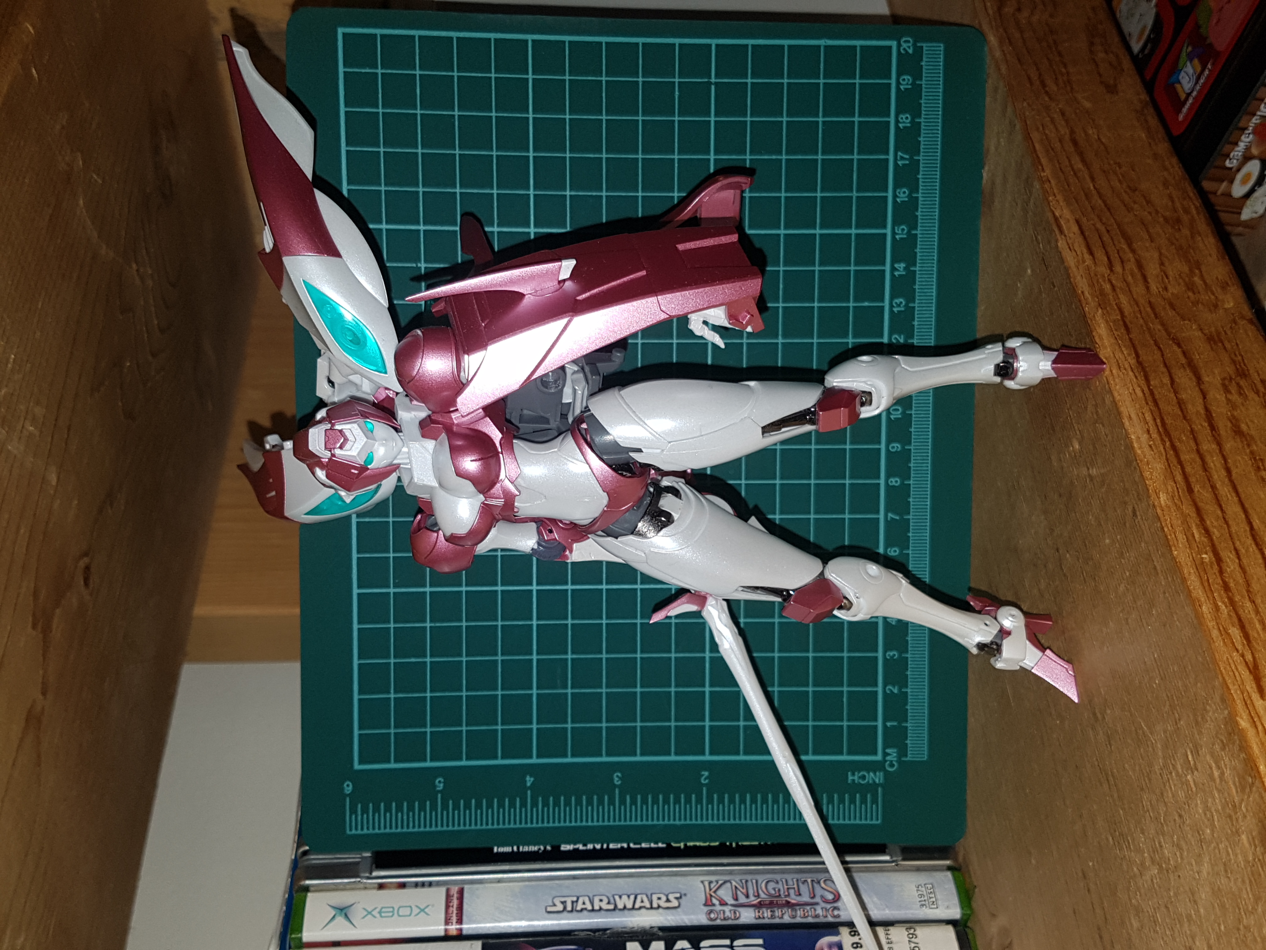 Nicee on my desk with a flight stand. Showing off her weapons.