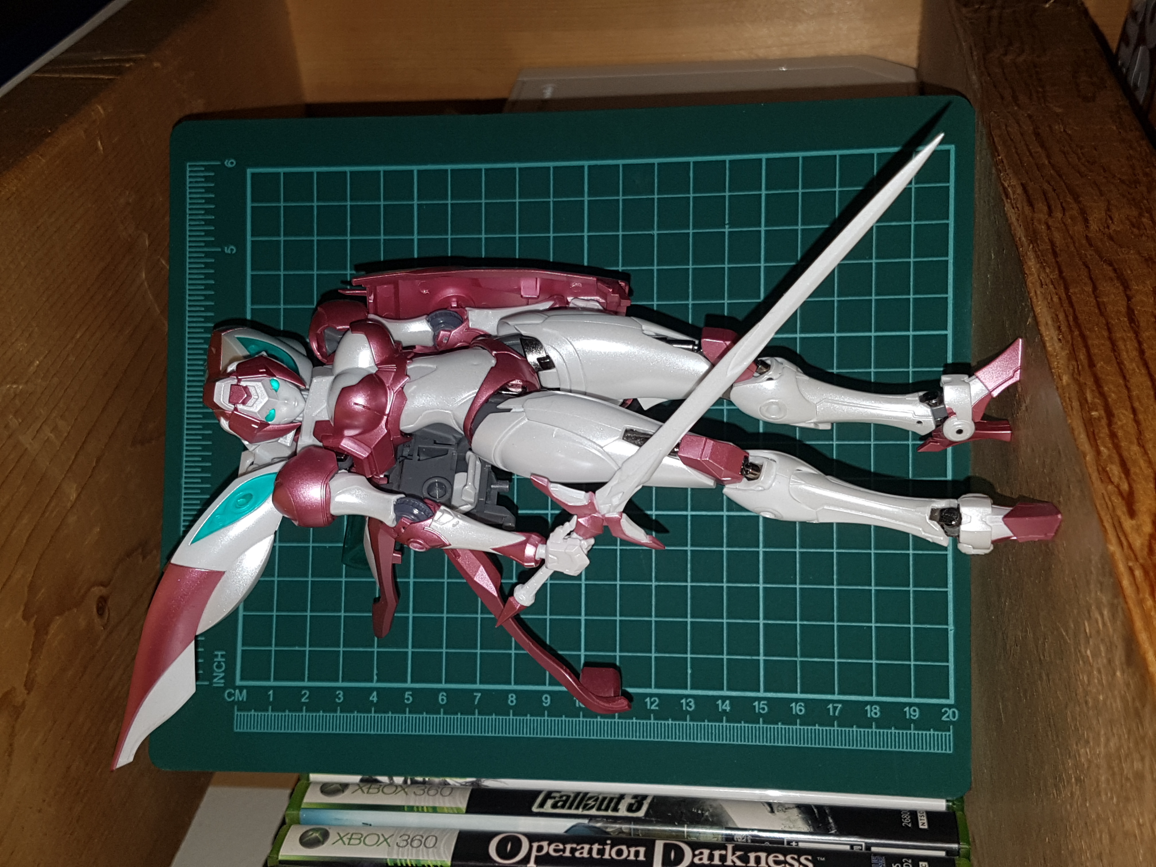 Nicee on my desk with a flight stand. Showing off her weapons.