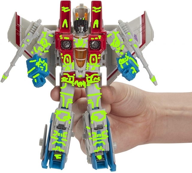 Then look at all of the recessed (or raised; however you want to look at) shapes on the upper legs of ER Starscream.