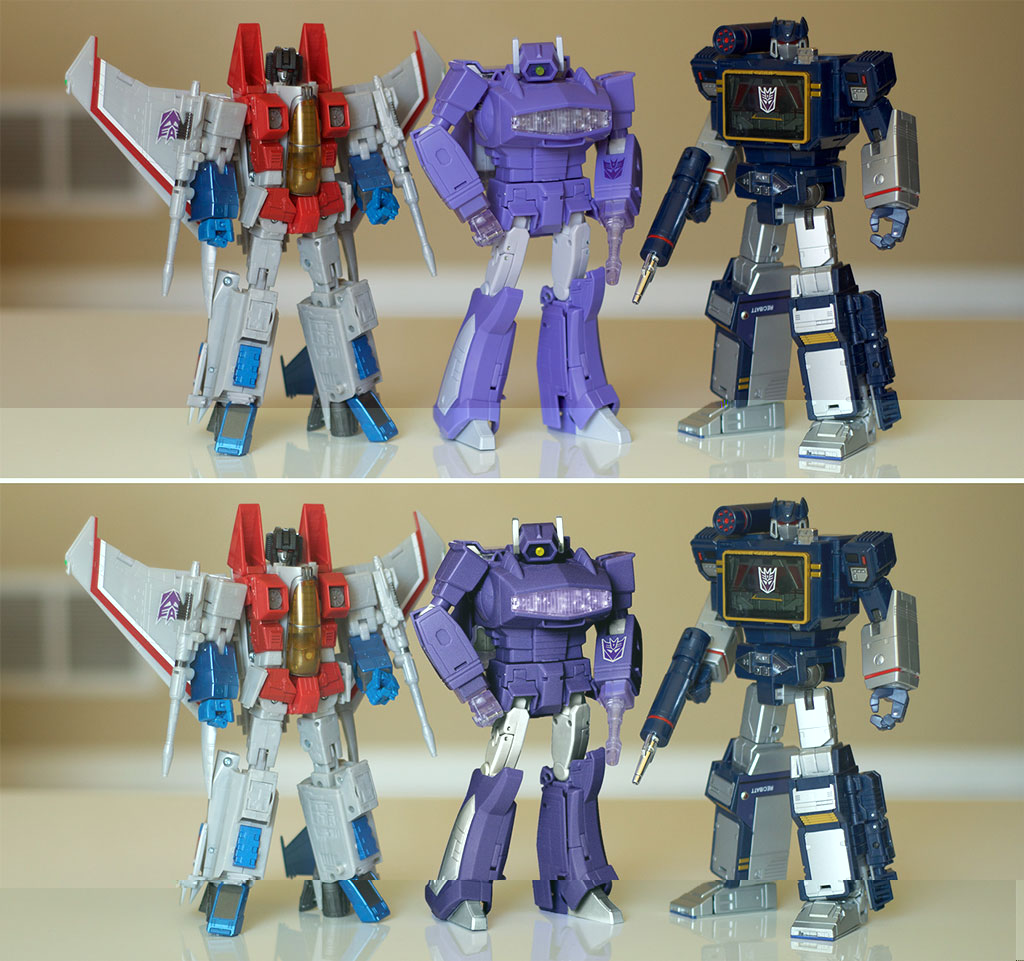 I feel like this is all part of the scheme. Come out with an OK color scheme first, do the "G1" toy accurate version later as MP-29T or MP-29G or whatever odd number scheme they come up with, and then do a convention exclusive gray "Shackwave" version later down the road. Do the least desirable color scheme first, and then go from there because people will buy the toy because it's a new mold. It seems like this is common practice these days unfortunately.