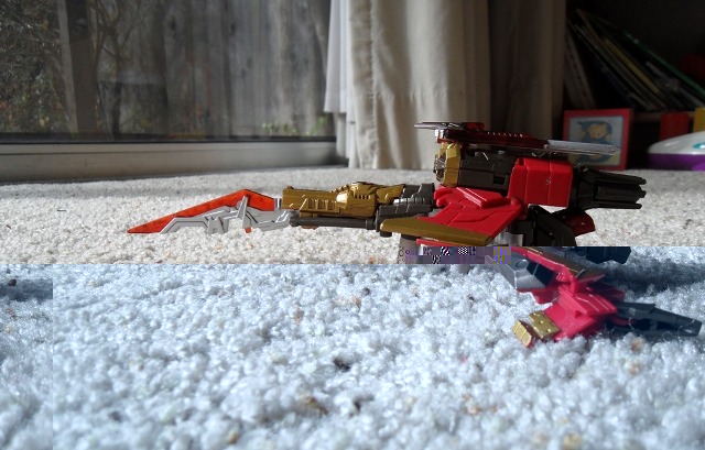 The wings and legs meet up perfectly. It looks like he was designed this way. It is like a triple changer, or maybe the designers decided to create a robot that can transform into two distinctly different vehicle modes. They sell one as Shockwave and one as Swoop. But later they decided against it and just went with Fireflight, then Airraid. It isn’t a perfect swoop, but it is very reminiscent of him, or very Cybertronian. Remember all of the Cybertronian versions are unique but similar to their G1 forms. And his colors are red, gold, and gray.