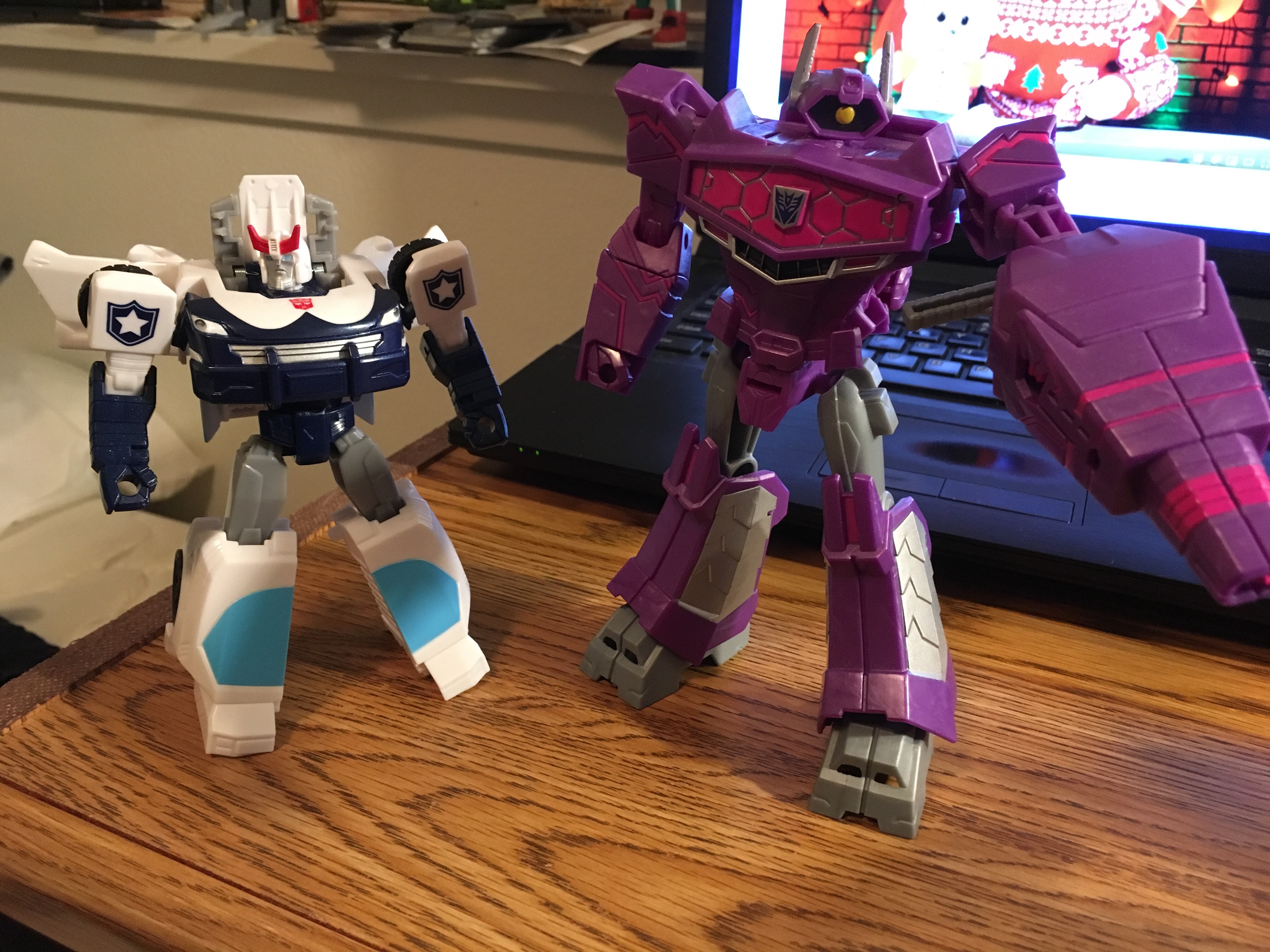 I haven’t had much of a reason to post on this forum since my only Cyberverse figure so far is the bigger Shockwave, but I had a rough work day and found grumpy warrior Prowl at Fred Meyer on my way home. Looked in about the same mood I was in so I took him home with me. He’s pretty fun! Not perfect of course, but I didn’t expect him to be. He’s got a non-intrusive gimmick (thank god), decent enough articulation and his head can even turn! Several steps ahead of wave one. I think he’ll end up on my IDW shelf, he looks just angry enough to be the same guy Chromedome threw off a cliff. I hope more Cyberverse figures can keep up this quality, I haven’t even been tempted to buy a single other toy besides the two I have.