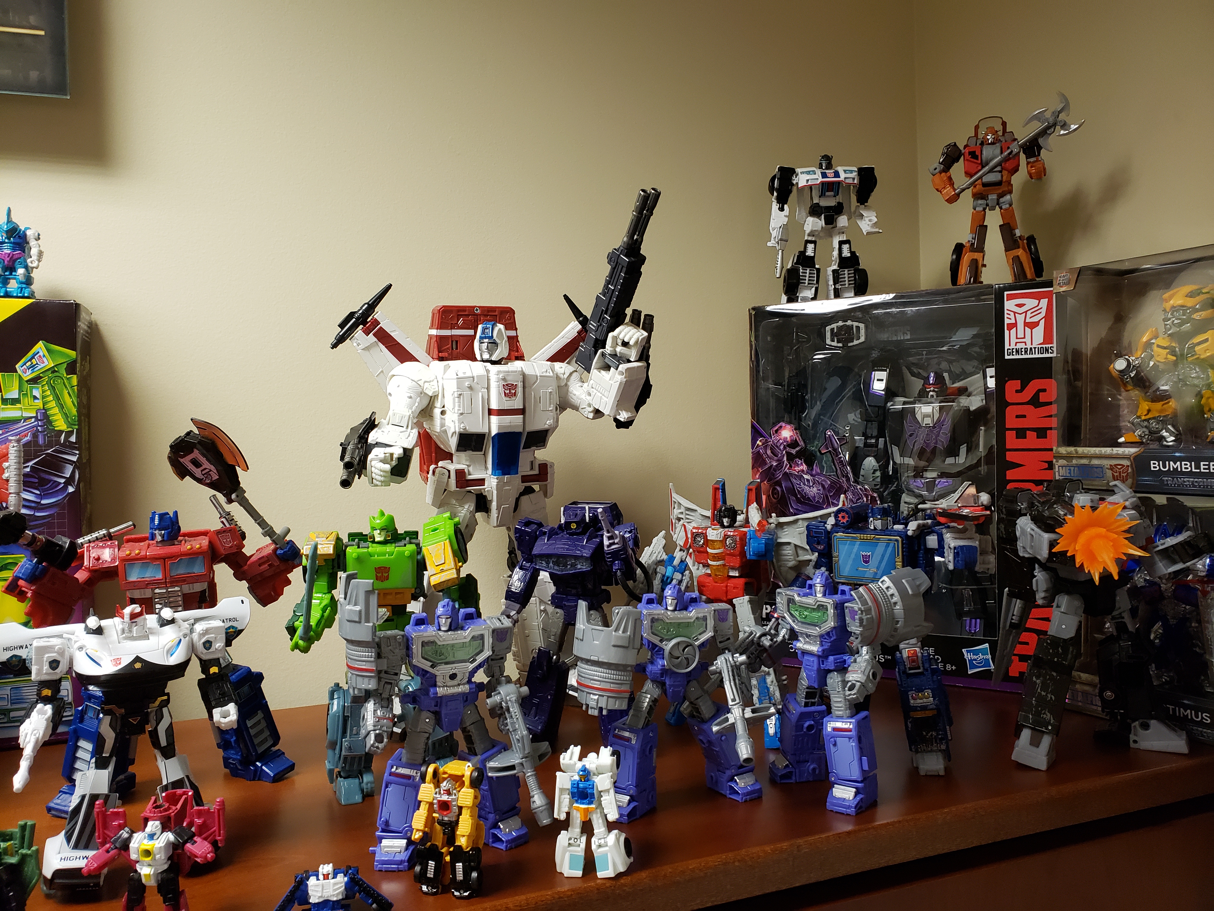 Currently (at work), I have the following: God Ginrai (legends), Elita 1, Siege Ultra Magnus, Generations Leader jetfire, PoP Optimus Prime, PoP Rodimus Prime, Titans return Blaster, Titans Return Soundwave, (and related cassettes for both) PoP Nemesis Prime, POP Rodimus Unicronus, Gerneations Leader Skyfire, Generations Leader Thundercracker, Siege Starscream, Siege Red Wing, RID MEgatron, RID Galvatron, Gerneations Cybertron Blaster, Generation Cybertron Soundwave, Generations Cybertron soundblaster