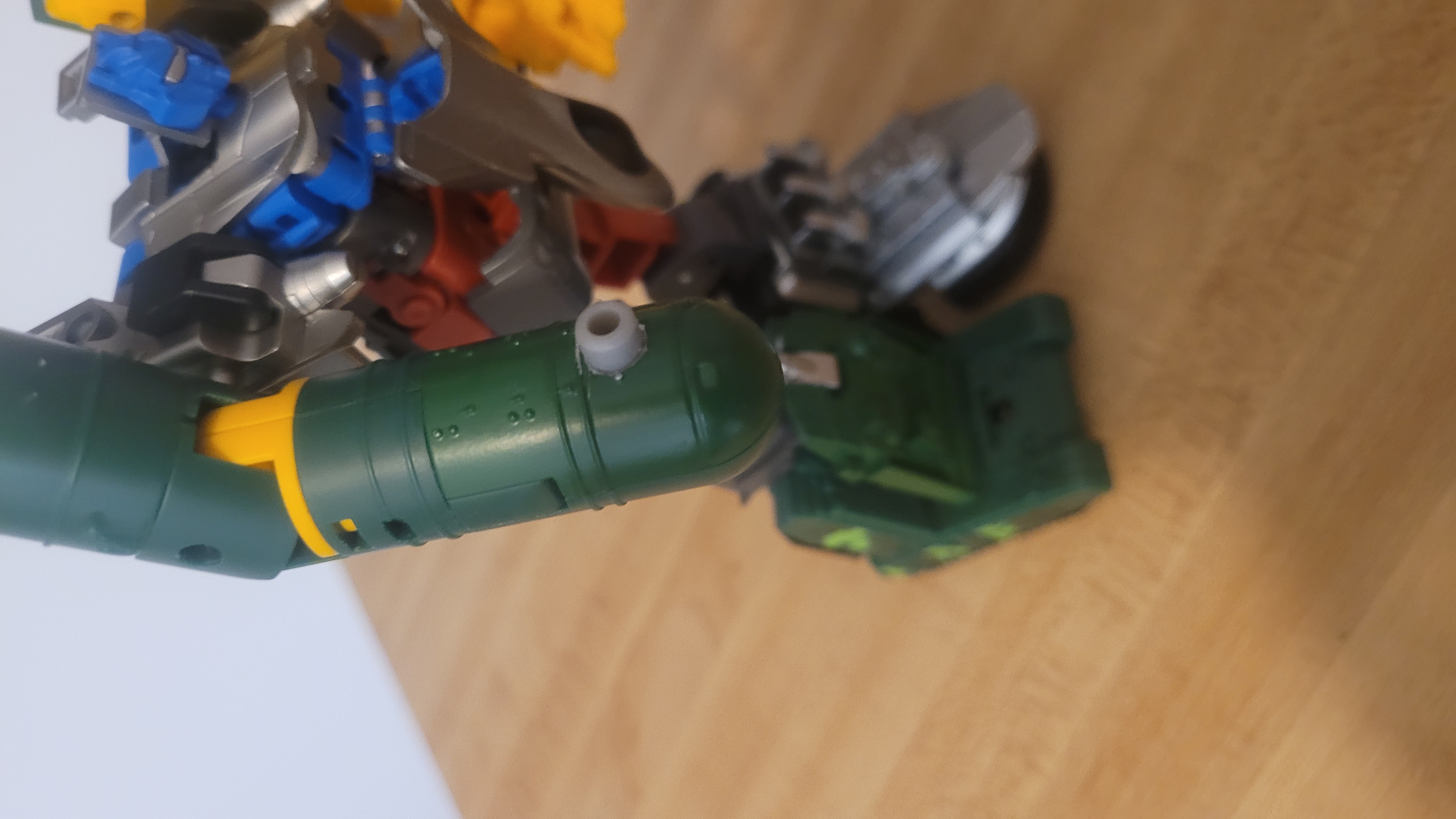 However, the fact that it can't hold the gun is dumb. So I made a mod by drilling the end of the arm-rocket-tanker, then from the underside, I inserted an adapter. This results in the rocket/arm having a small "vent" on top, but the gun fit perfectly.