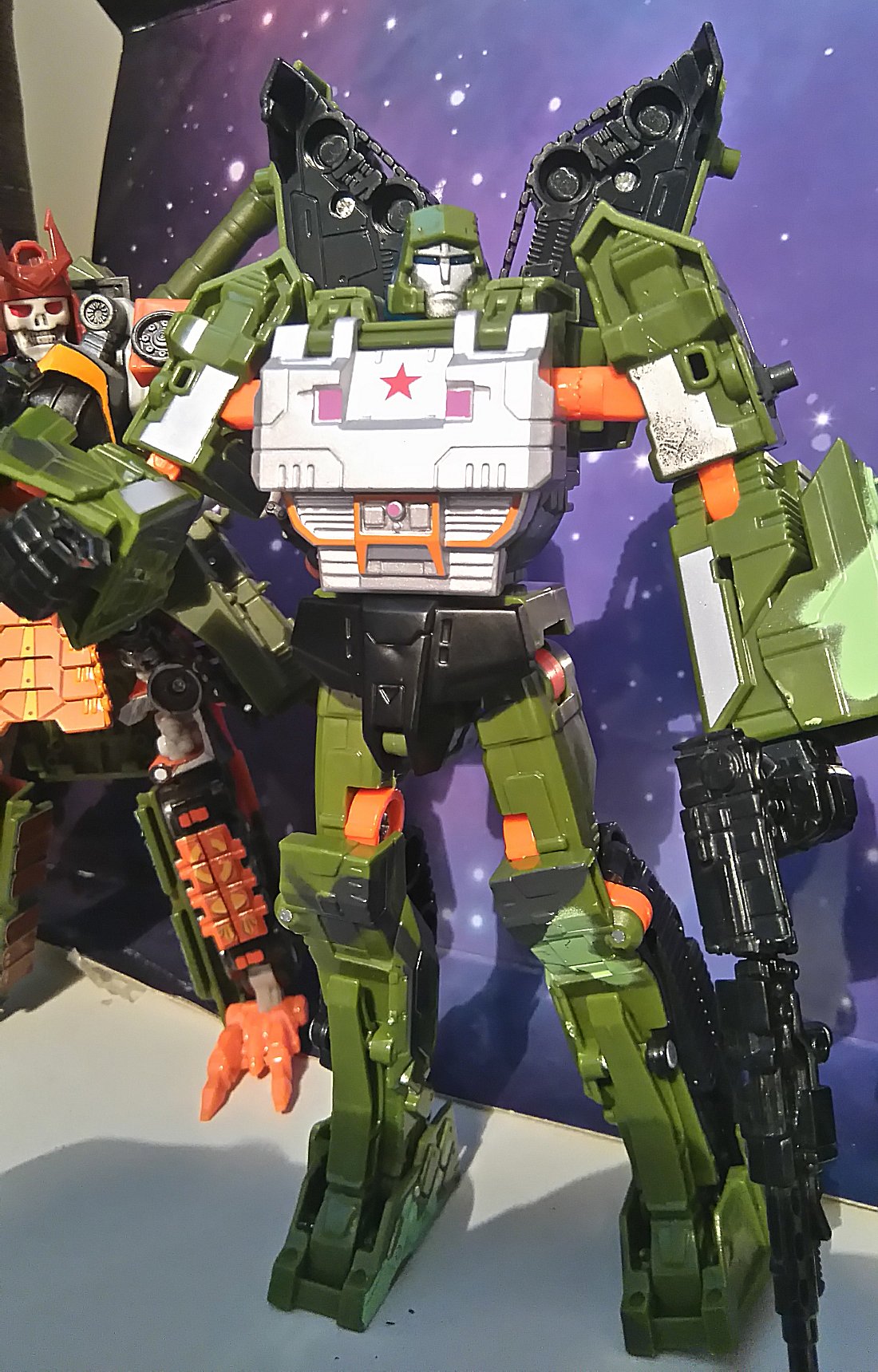 Feels solid enough and looks good in both modes. Not sure why they went with G2 green camo everywhere execept the chest area but it's a neat toy. My fave bits about the mold is how the tank turrent can turn despite becoming his arms, and also that the robot has waist articulation. The rear of the robot mode with the teads appears to have been very simplified compared to the official Leader figure so cannot come together or slide lower into a tidy backpack but it's not too bad. Crotch piece and forearm bits come off a bit easily during transformation due to the way they clip on but can fix that. Comes with his fusion cannon and the two small weapons that combine into a longer rifle. Also includes instruction sheet but came in a just polysterene panels packaging rather than any proper box.