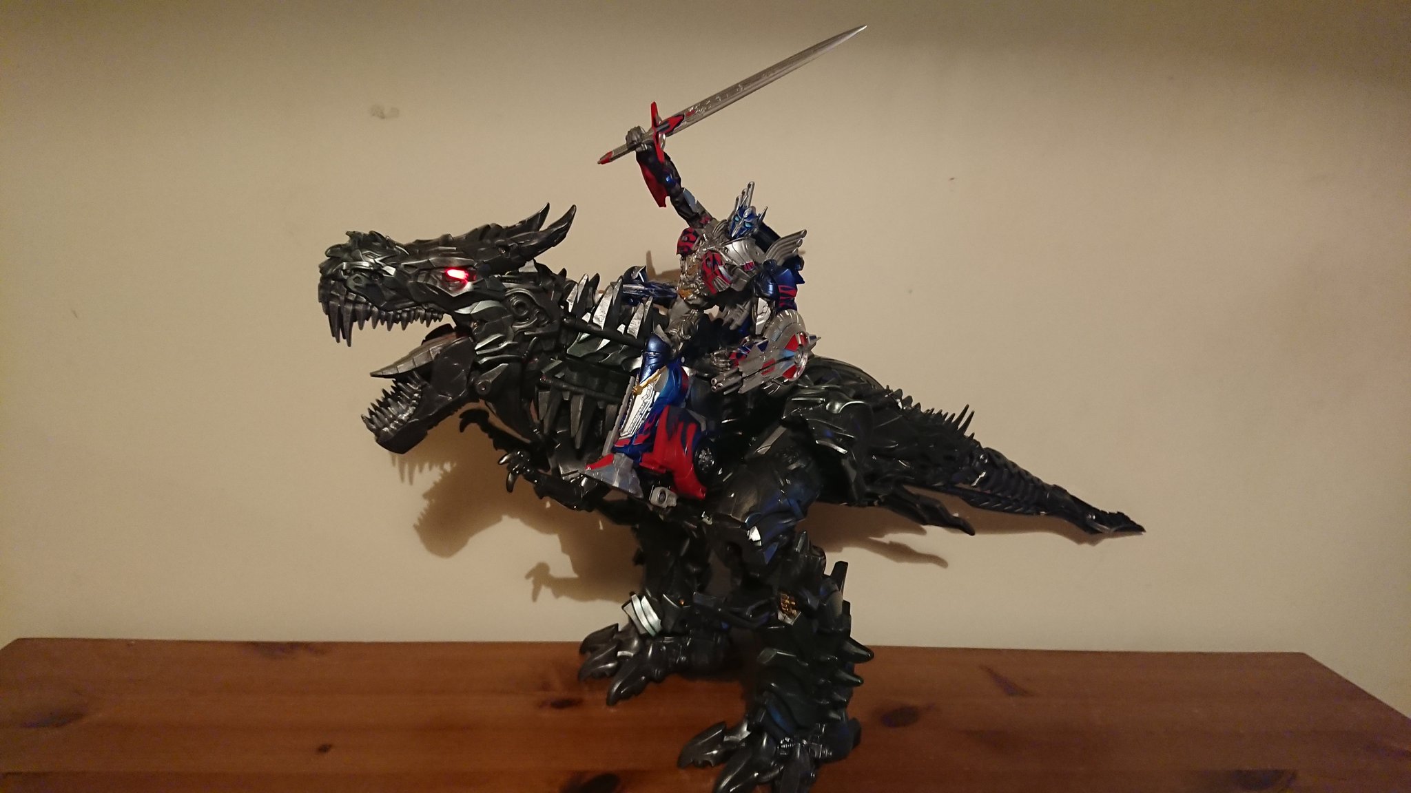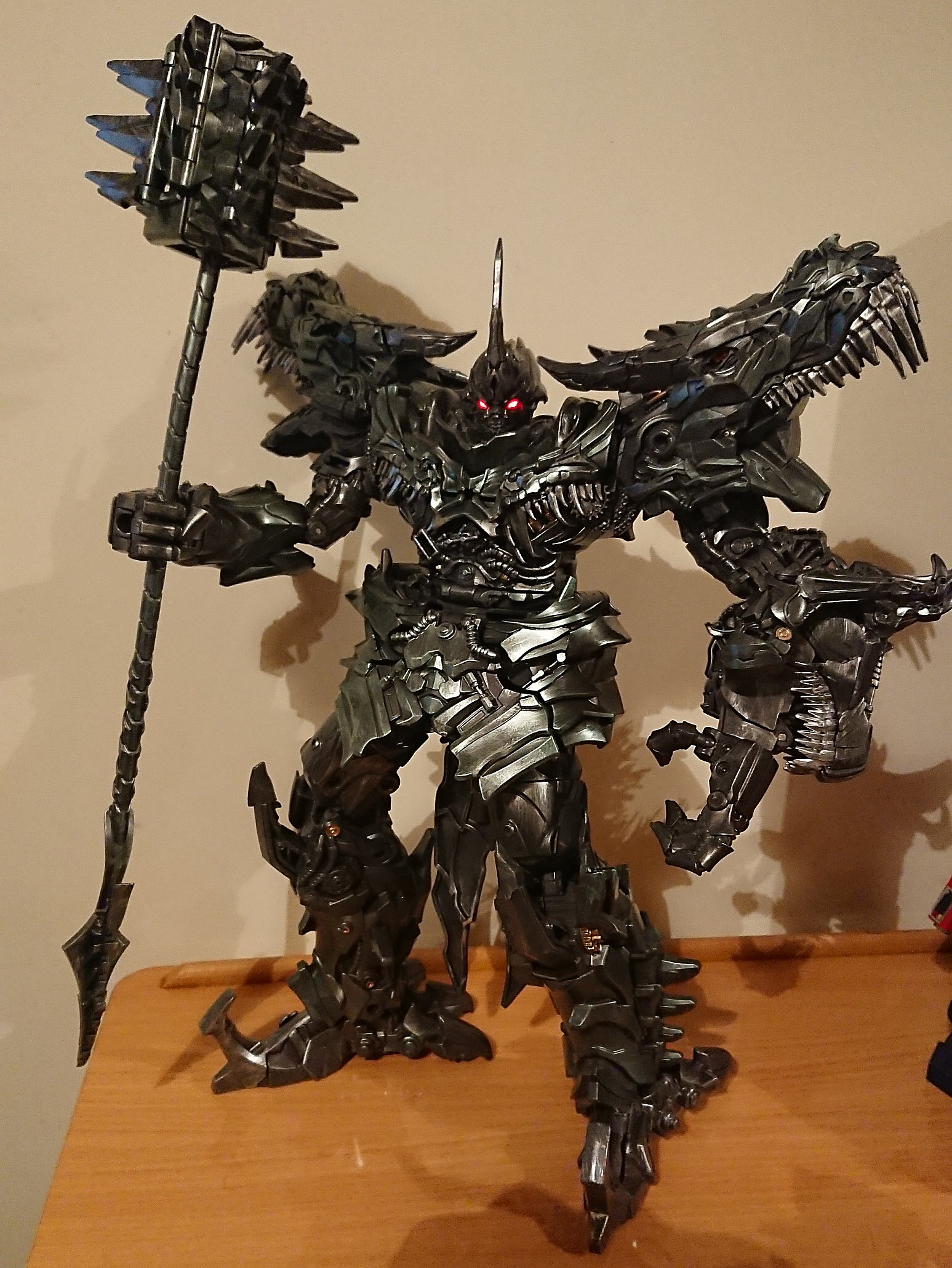 Now this is a big Grimlock. Black Mamba LS05 Ancient Leader. Upsized KO of Studio Series Grimlock. Size alone is impressive but also has upgraded hands with some articulation in them, spiked maul weapon, some die-cast parts and light up eyes in both the robot head and Dino head. Official one was just too small for the scale as it had to fit in Studio Series leader class category. This is much more accurate and The Last Knight Voyager Optimus Prime finally has his steed.