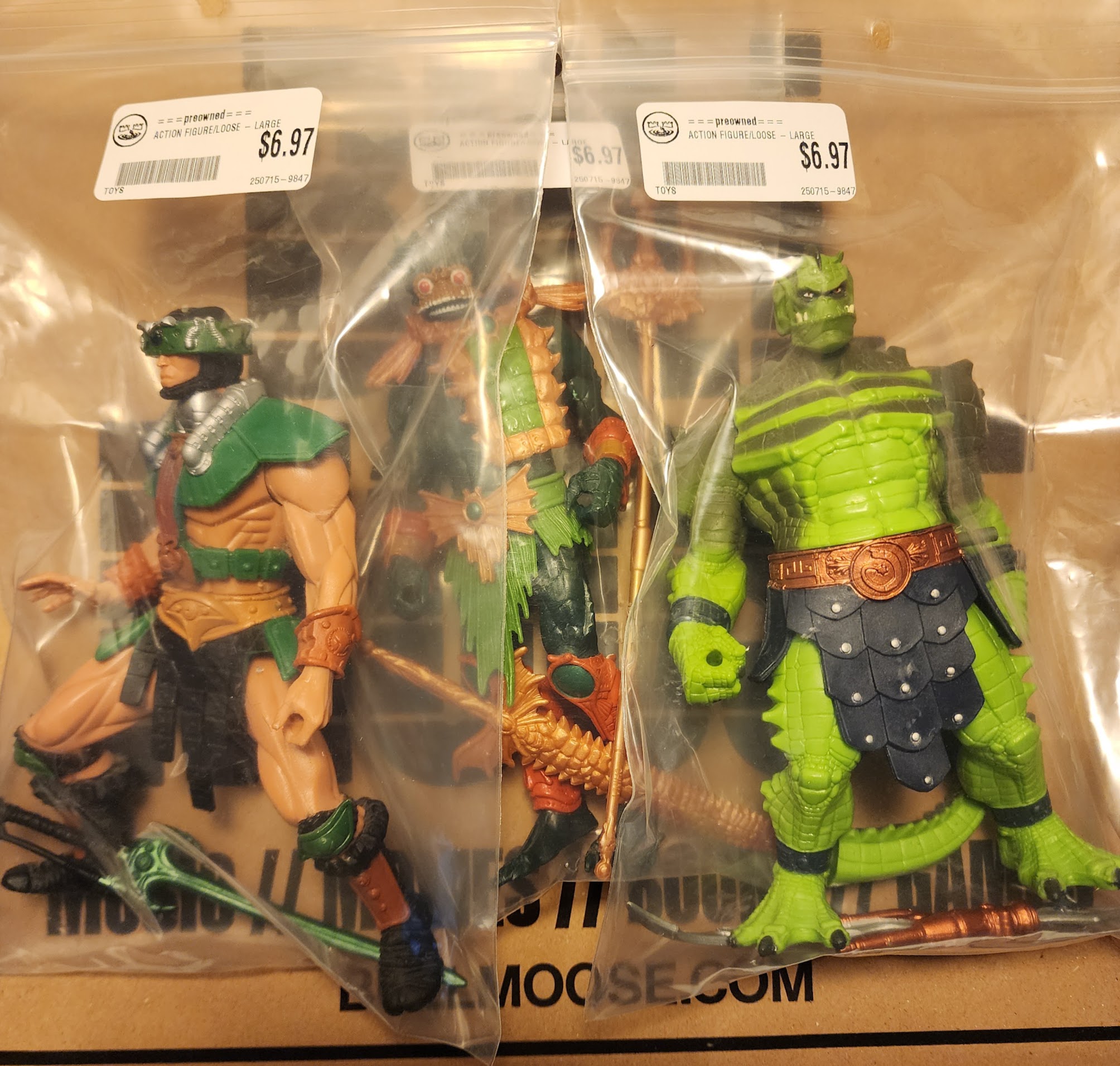 So the local record store/movie store/bookstore/game store, Bull Moose, also buys and sells all of that stuff used. They also buy and sell used toys and it looks like somebody dumped their MotU collection there. Saw McDonalds Skeletor and Beastman, ReAction cartoon Grizlor and cartoon Trap Jaw, several carded Origins figures I already have, Cartoon Collection Skeletor, Evil-Lyn and Tri-Klops already, 200X Beastman (pretty sure I have him, and he didn't come with his whip) and these that I bought:
