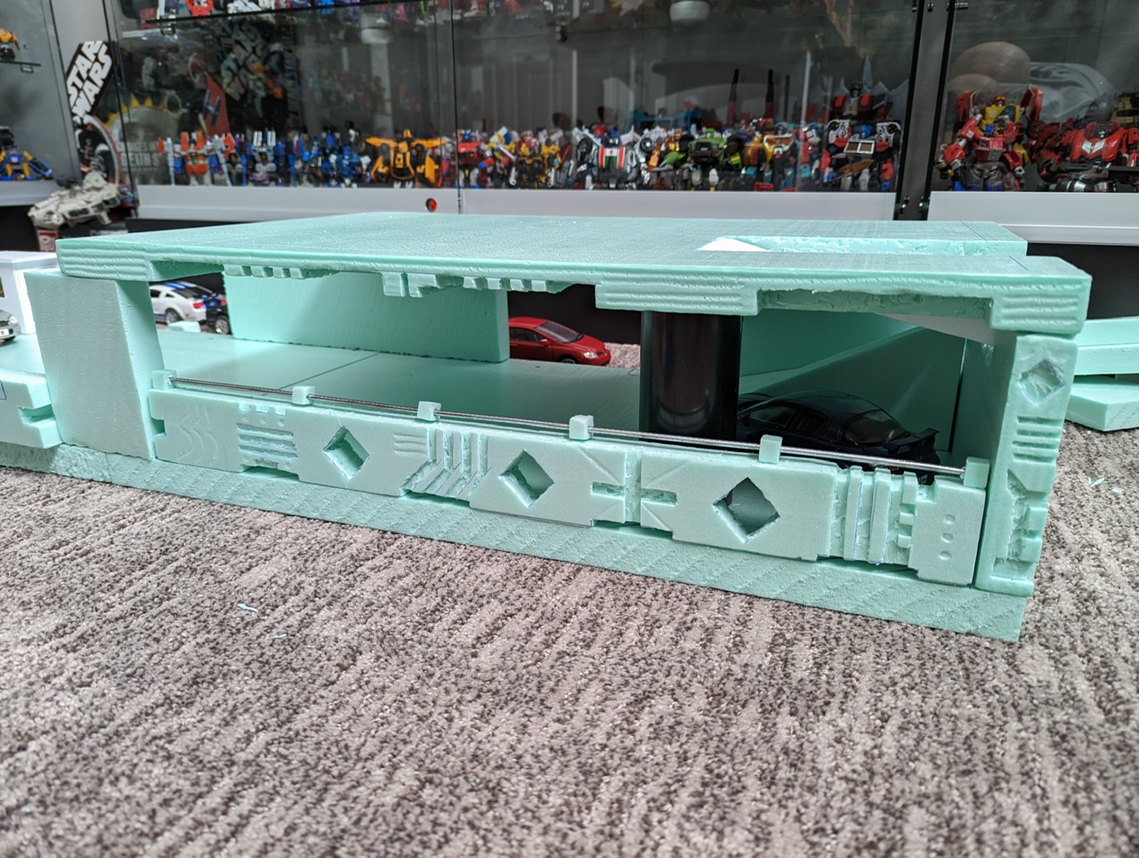 I decided to start my next diorama project that is for my Alternator line shelf. The idea is to have a double level type parking garage. In the photos you can see how the ground floor started out to its current look. While i still need to add some pieces to the back wall and other details, the ground floor is coming along nicely.