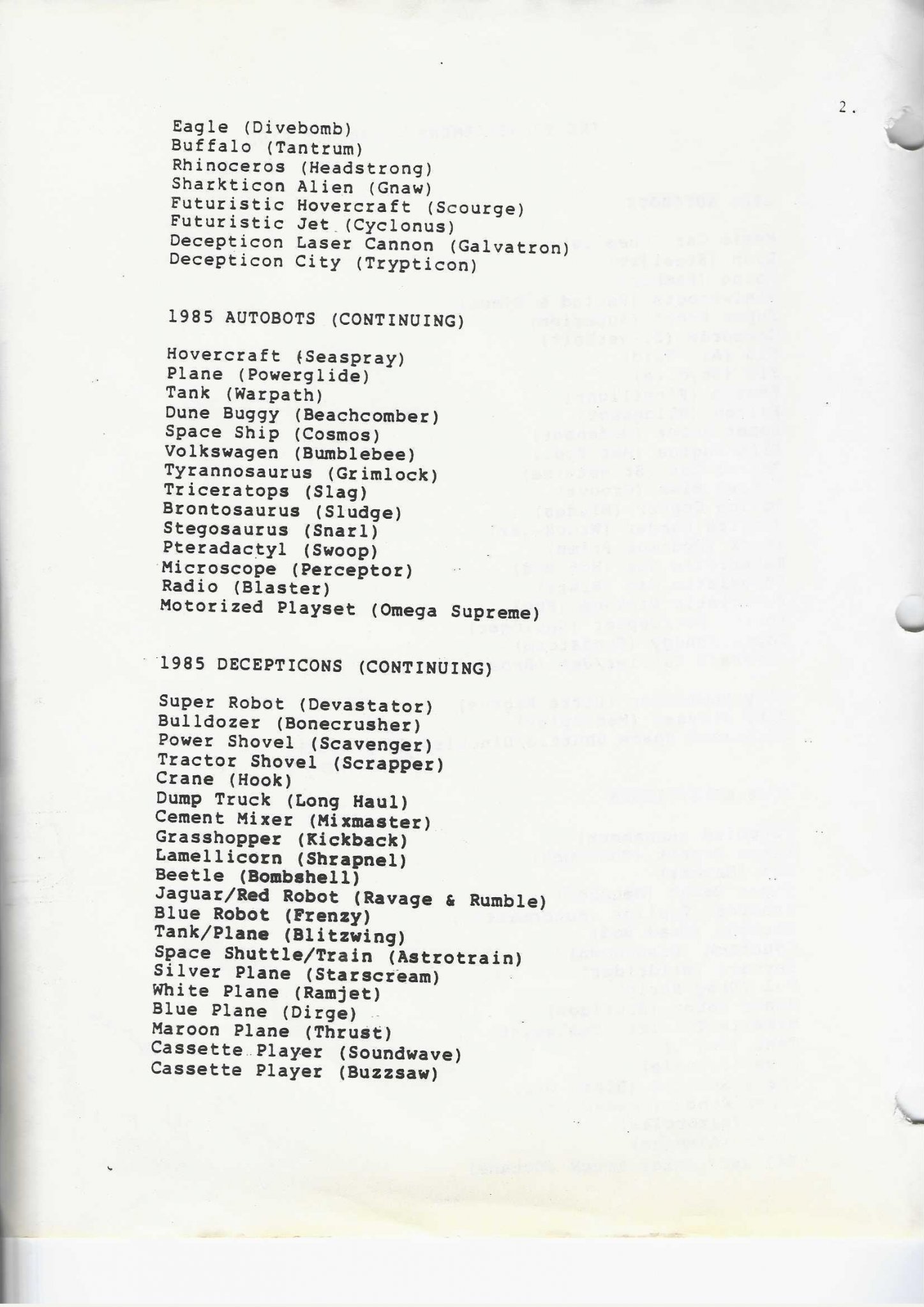 This 186 page document covers Bob Budiansky profiles and Marvel productions model sheets for nearly all of the incoming 1986 toyline (excluding the new minibots Swerve, Pipes, Tailgate, Hubcap and Outback), as well as returning 1984 and 1985 characters.
