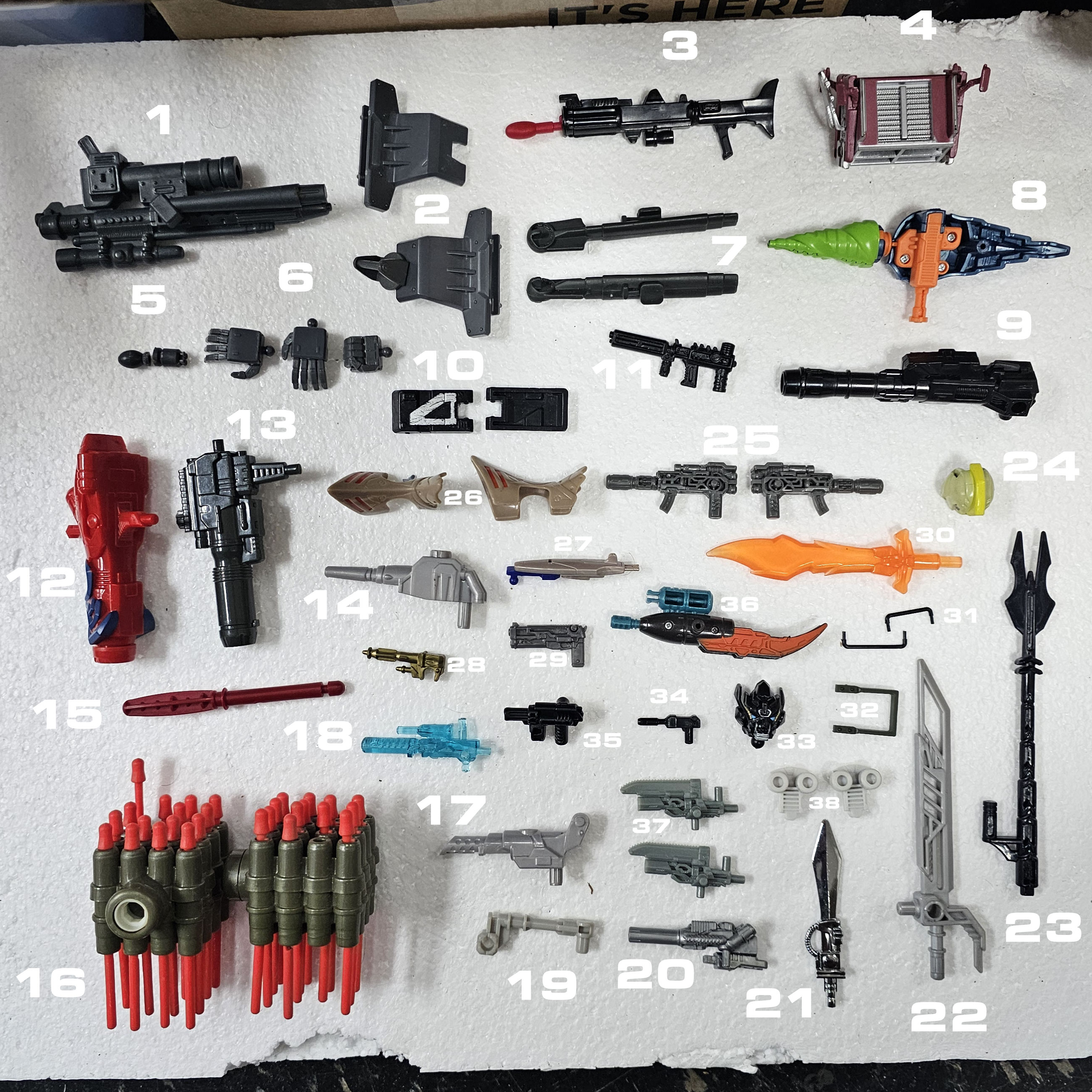 Here are some recent parts I got into the Seibertron Store that I couldn't place. There are a few that I know what they belong to, but left in because I didn't sort them yet. I filled in the blanks for a few below. Some of the accessories, most notably the ones in the top left quarter of the image, are not Transformers accessories but I'd still like to know what they belong to if possible. Any help would be greatly appreciated.